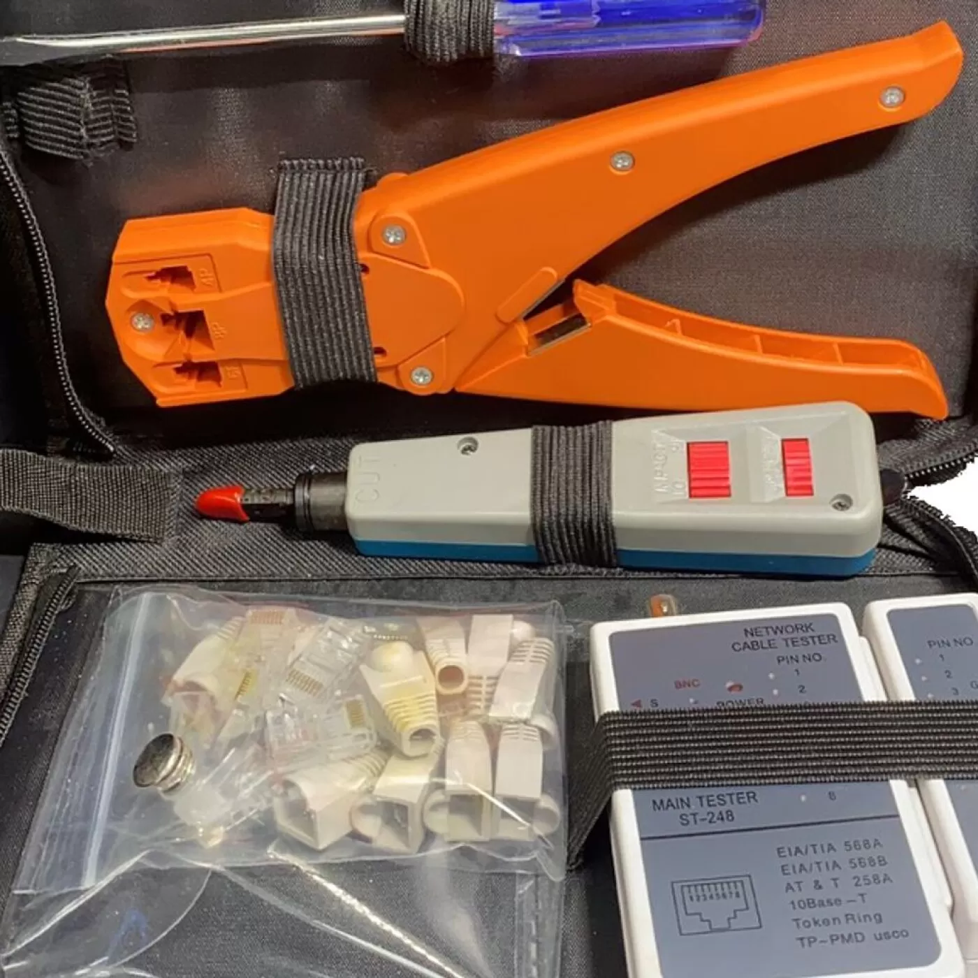 As 7 peças incluídas no kit desempenham funções específicas, abrangendo todas as etapas do processo de crimpagem. Entre as ferramentas essenciais, destacam-se o alicate de crimpagem, o decapador de cabos e o testador de cabos. O alicate de crimpagem é fundamental para fixar o conector de maneira adequada, proporcionando uma conexão firme e confiável. O decapador de cabos facilita o processo de preparação dos fios, removendo a camada externa e expondo as extremidades necessárias para a conexão. O testador de cabos, por sua vez, é uma ferramenta indispensável para verificar a integridade da conexão após a crimpagem, garantindo que o cabo está funcionando corretamente.
