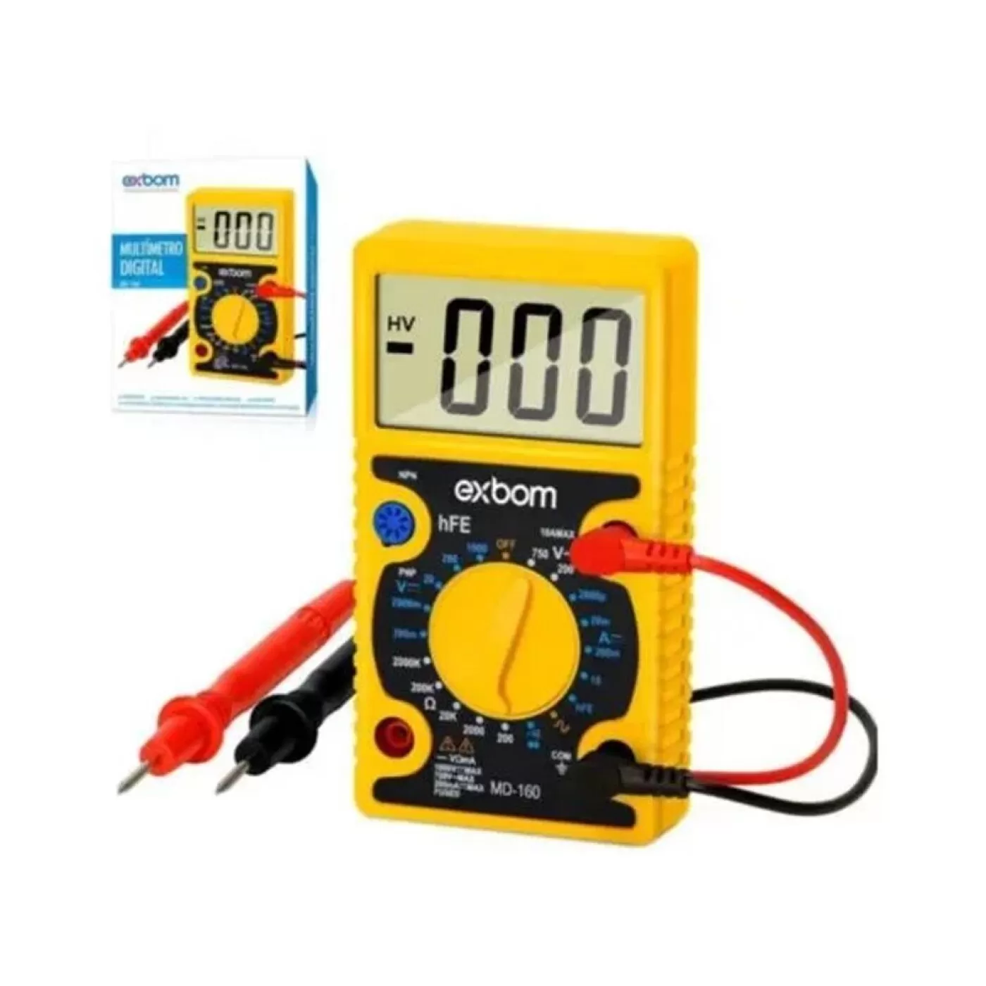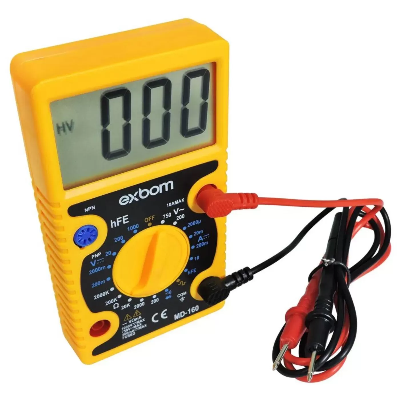 O multímetro MD-160L é um instrumento digital portátil, com fusível de auto restauração, teste de linha viva, hoste protetor, LCD de 62x32 mm com o máximo caracteres 1999 ,congelamento de leitura, desligamento automático e mudança de faixa manual. Realiza medidas de tensão DC e AC, corrente DC, resistência e testes de linha viva, hFE de transistor, diodo e continuidade.