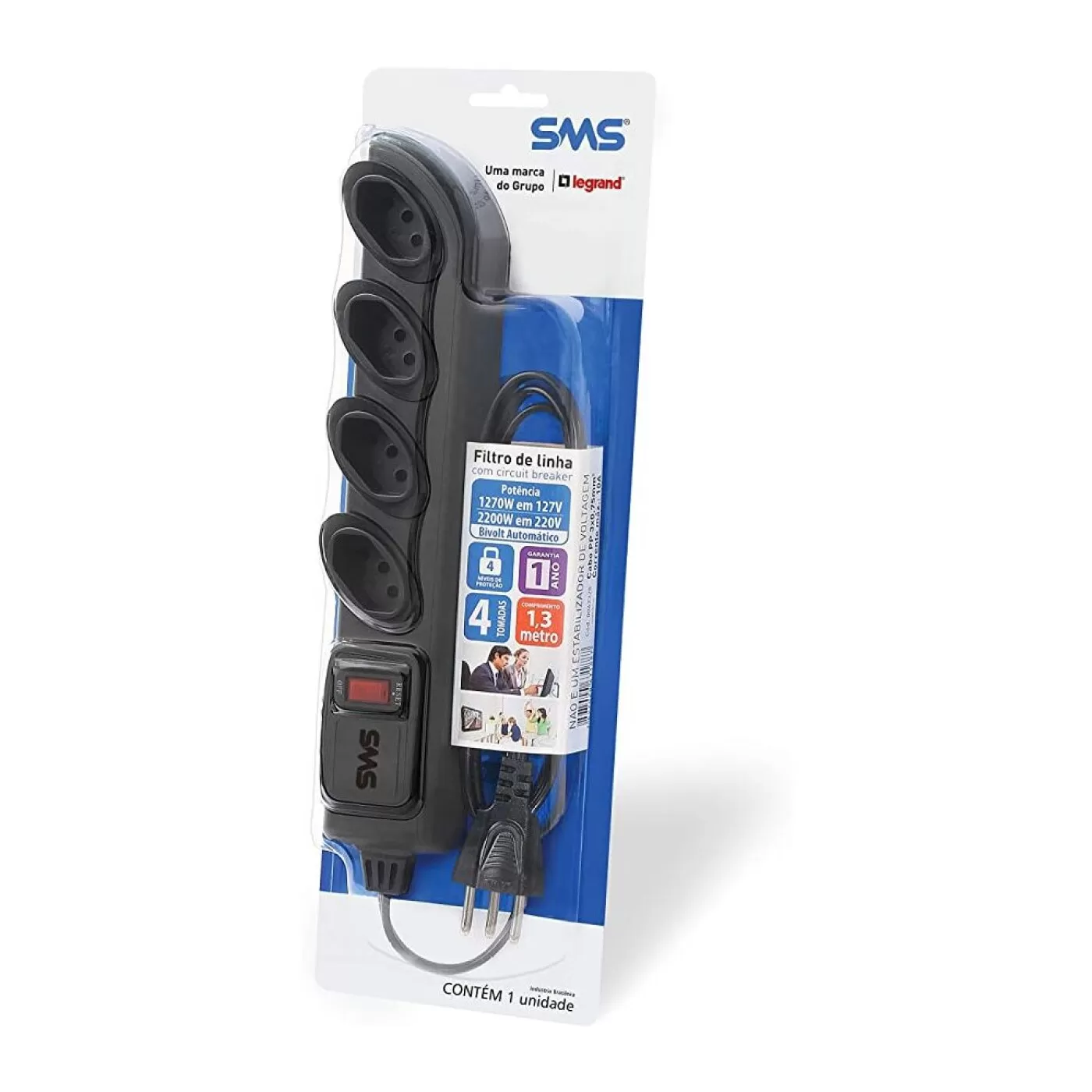 Desenvolvido em conformidade com a norma NBR 14136, a Filtro de Linha SMS 62328 - 4 Tomadas (1.3m) possui 4 tomadas de saída no ângulo de 45° para facilitar a conexão dos seus equipamentos sem que um obstrua o espaço do outro. O Filtro de Linha SMS 62328 também conta com orifícios da parte traseira para fixação em paredes, mesas ou racks.