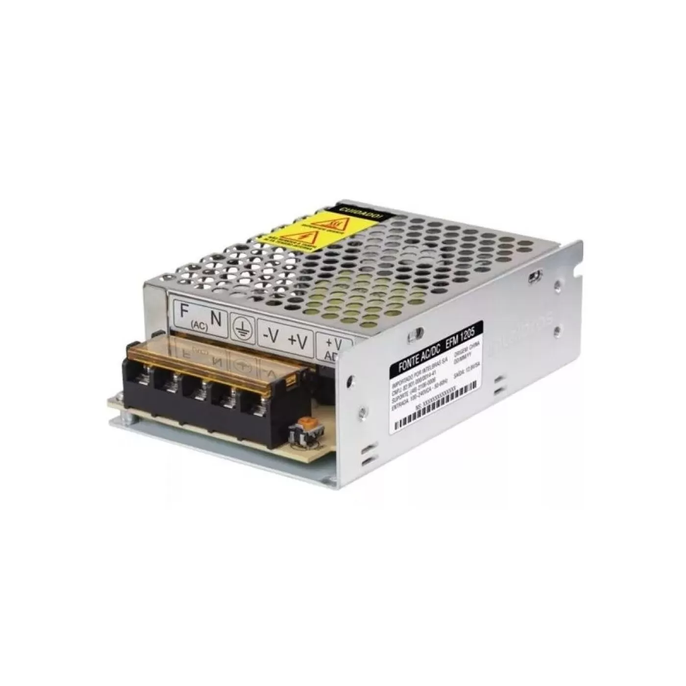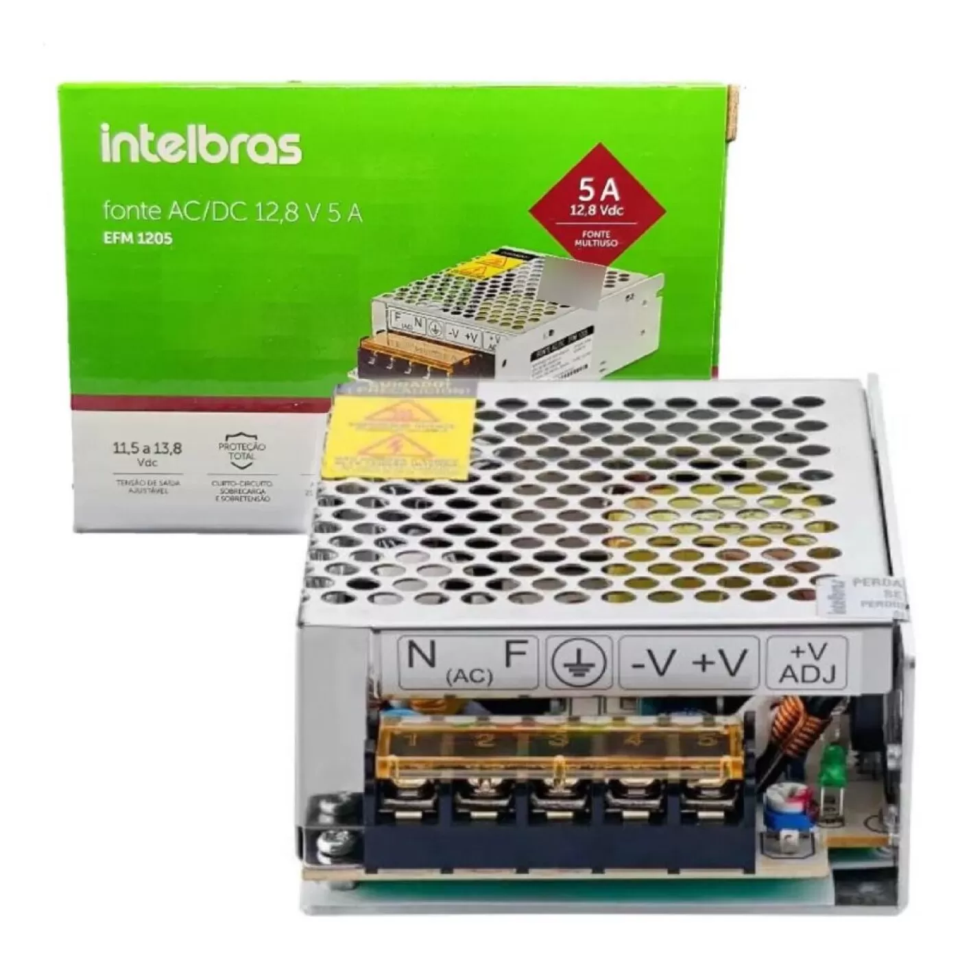 A fonte de alimentação AC/DC Intelbras modelo EFM 1205 possui entrada automática de 100 a 240 Vac, sem necessidade de seleção por chave da tensão de entrada, com filtro especial contra ruídos e possuindo proteção contra surtos e sobrecorrente da rede elétrica.