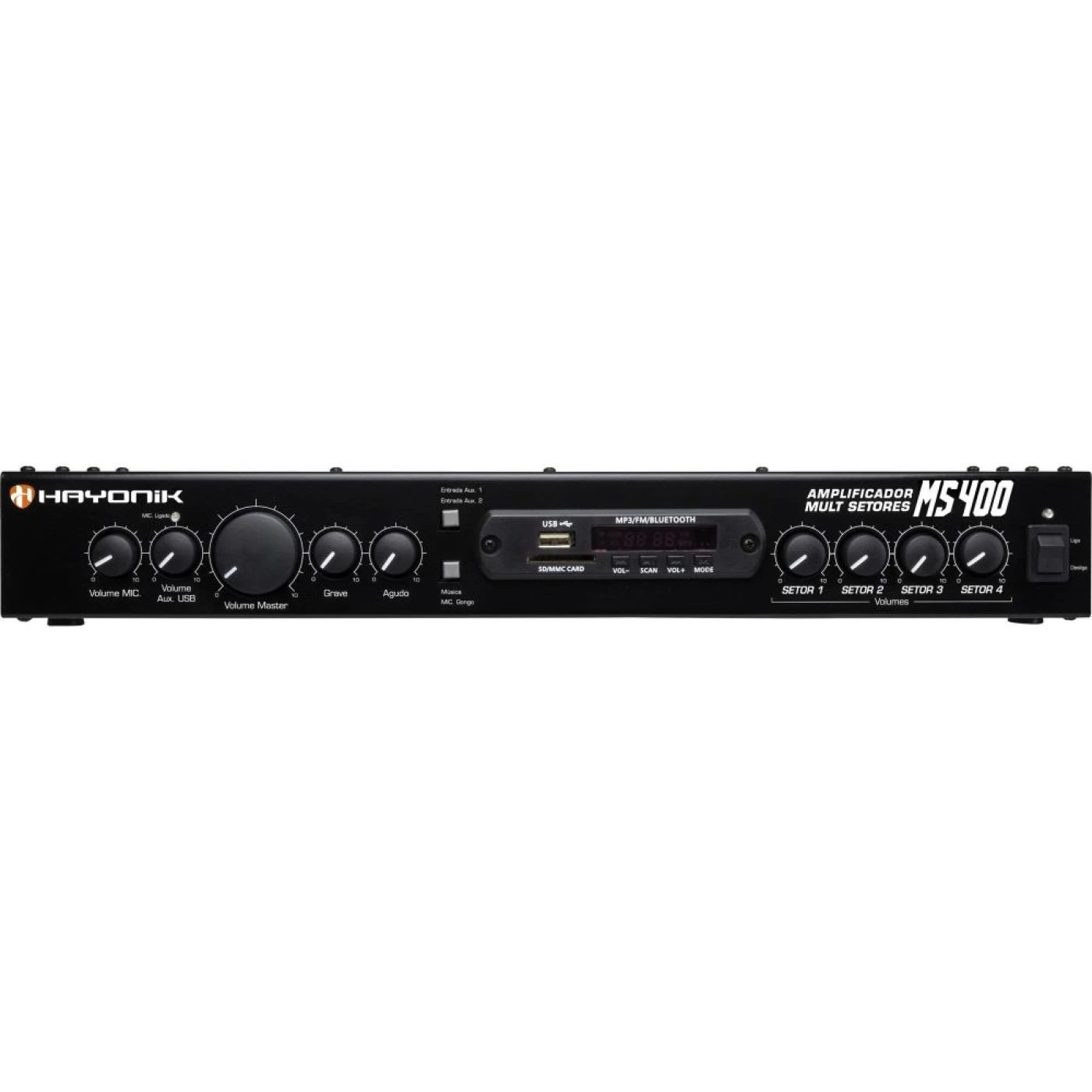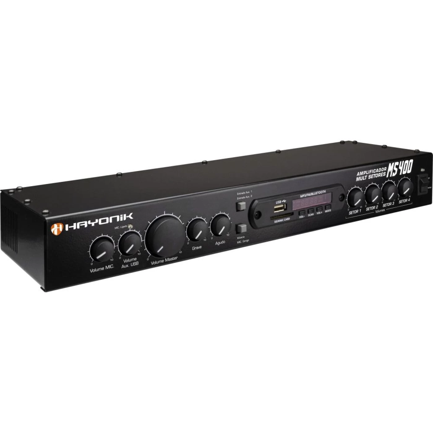 Saídas: 4X Bornes de Saída para as caixas, Saída de Sinal (P10) para o expansor Hayonik MS400;