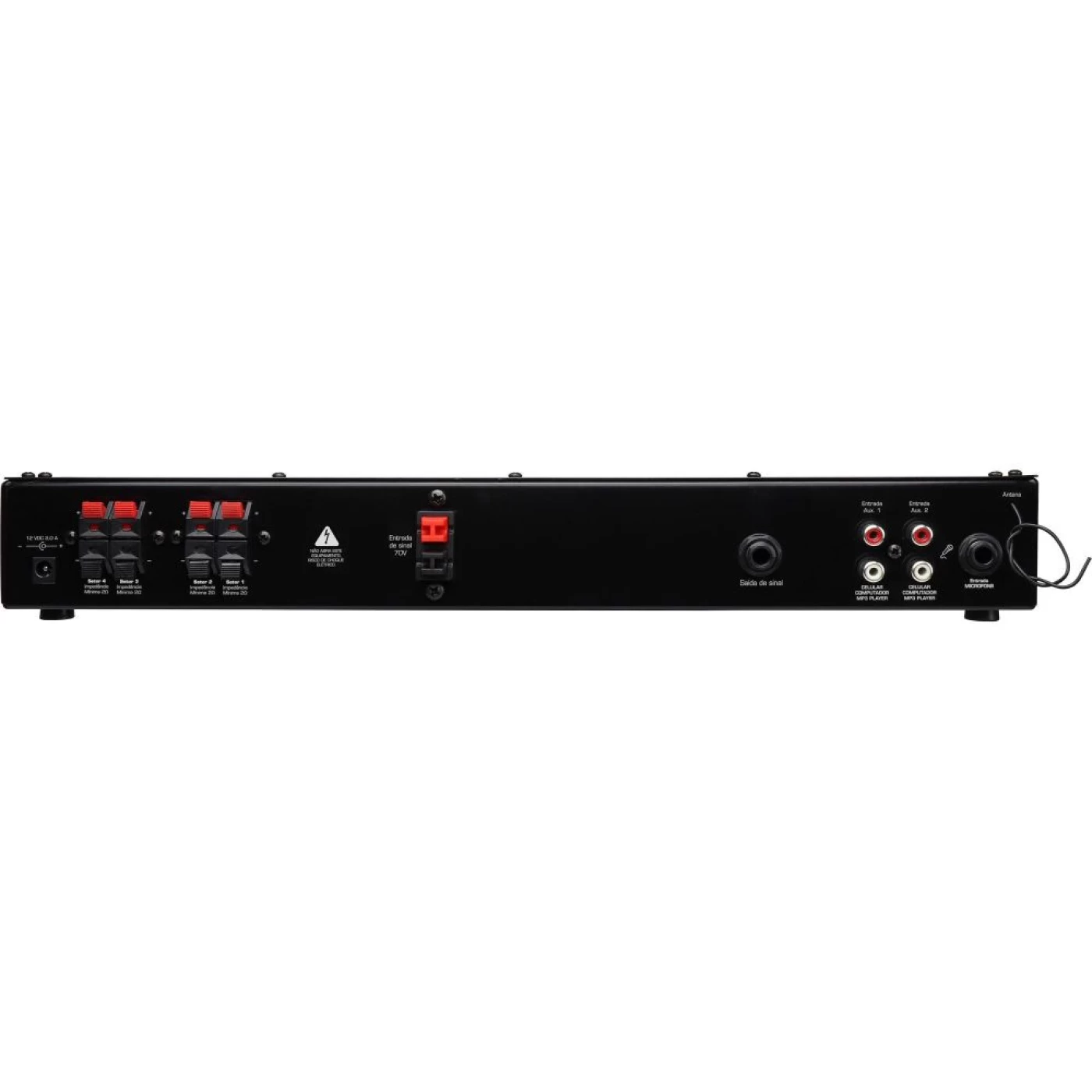 Possui entrada de microfone ,entrada USB para pen drive, Rádio FM, Conexão Bluetooth ,Entrada SD CARD ,Entrada De Microfone e duas entradas auxiliares RCA para aparelhos eletrônicos.
