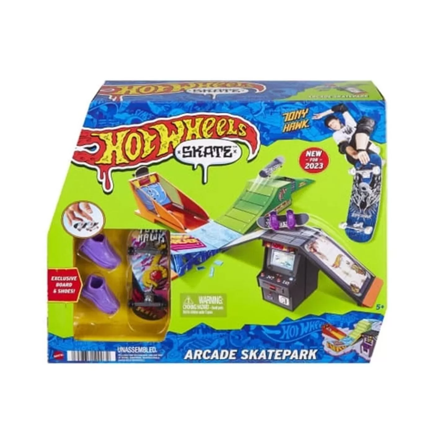 Ele vem com um skate de dedo exclusivo e totalmente montado, projetado em colaboração com o lendário Tony Hawk.