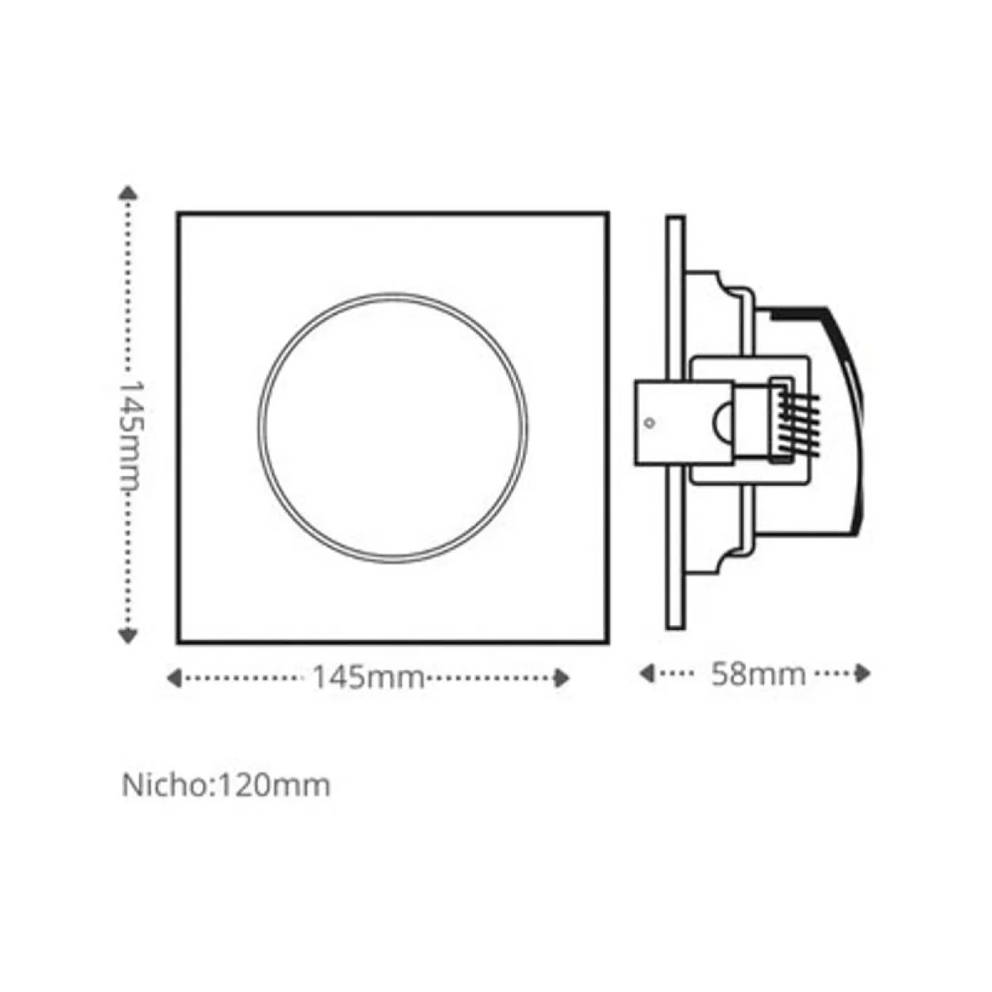 Fabricado em plástico PBT de alta qualidade, o spot oferece durabilidade e resistência. Sua instalação é simplificada pelo driver integrado e dimensões compactas de 145 x 145 x 58mm. O nicho de 120 x 120mm garante encaixe perfeito.
