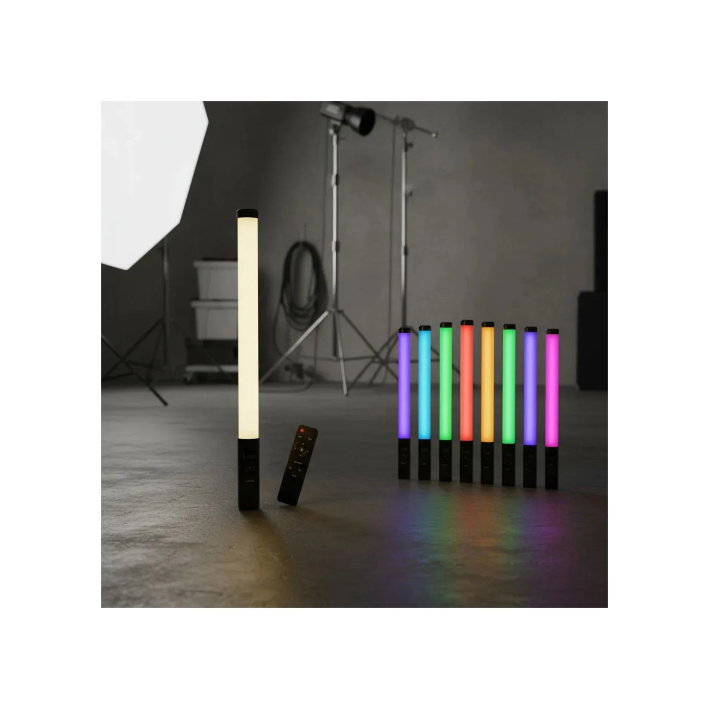 Bastão de luz LED RGB recarregável da marca Atomo, modelo MO-CDYQ2, ideal para iluminação decorativa, eventos e criação de efeitos visuais. Compacto e portátil, com bateria interna de longa duração e controle de cores personalizável.
