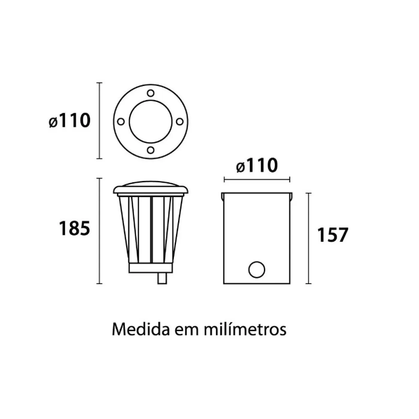 Atenção, o Embutido de Solo possui medidas de Ø110x185mm, porém canopla de instalação possui Ø110x157mm. Para facilitar, acompanha kit de instalação.
