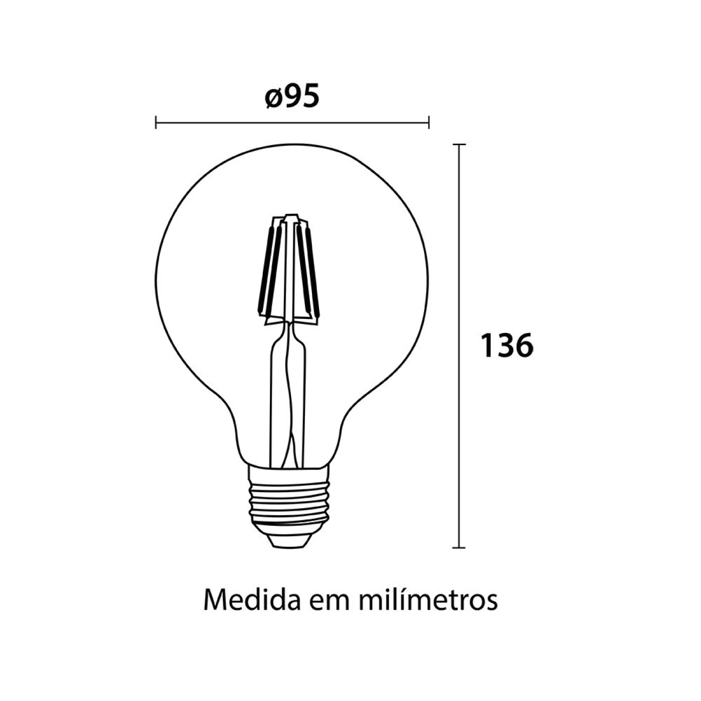 A Lâmpada Filamento LED G95 4W da Blumenau Iluminação tem design delicado e moderno, escolha perfeita para integrar os ambientes com leveza e eficiência luminosa. Possui soquete E27 em alumínio e lente de vidro âmbar, atende as variações de tensão entre 110V e 220V na temperatura de cor branco quente 2200k.