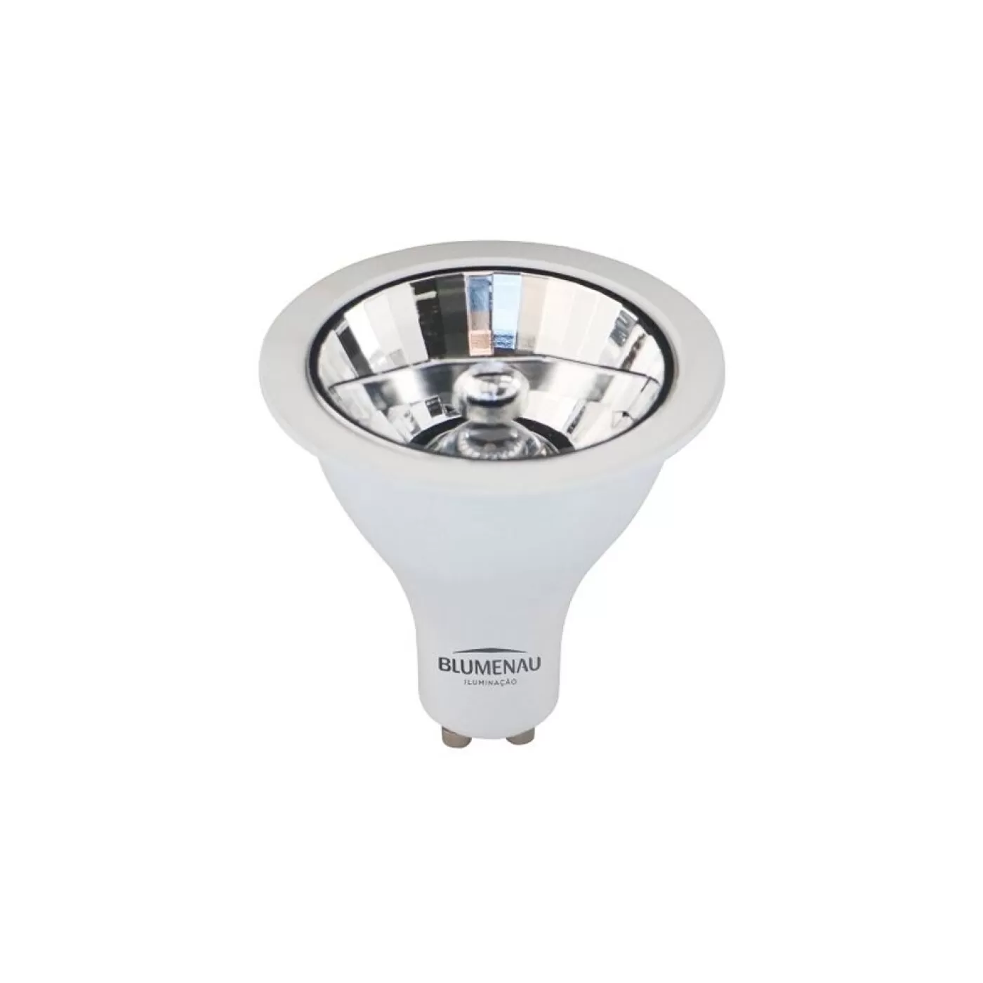A Lâmpada LED AR70 4,8W Da Blumenau Iluminação possui design contemporâneo. Com interior metálico e ótica recuada que causa redução de ofuscamento, compõe com elegância luminárias e spots.
