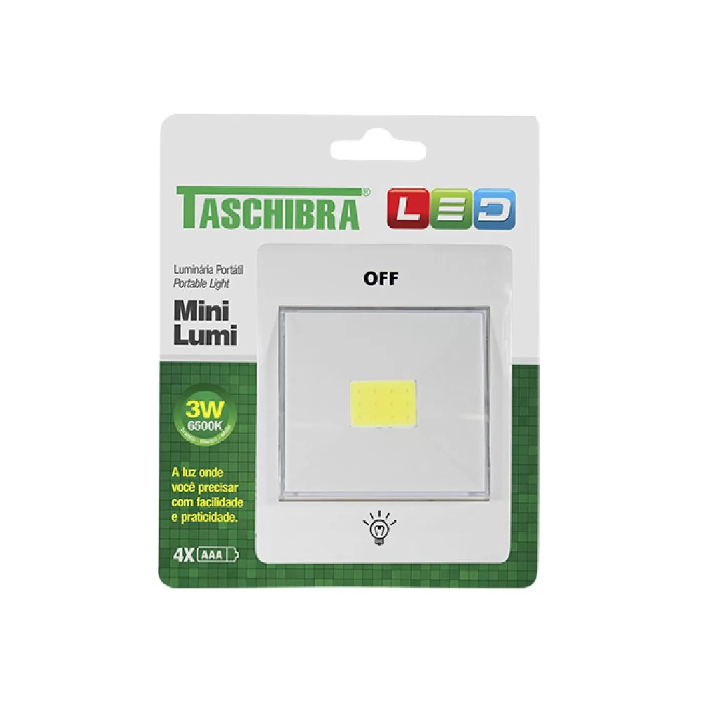 A luminária Mini Lumi é portátil é alimentada por 4 pilhas AAA(não inclusas), produzida em plástico, tem botão liga/desliga e pode ser fixada por imã, velcro ou parafuso.
