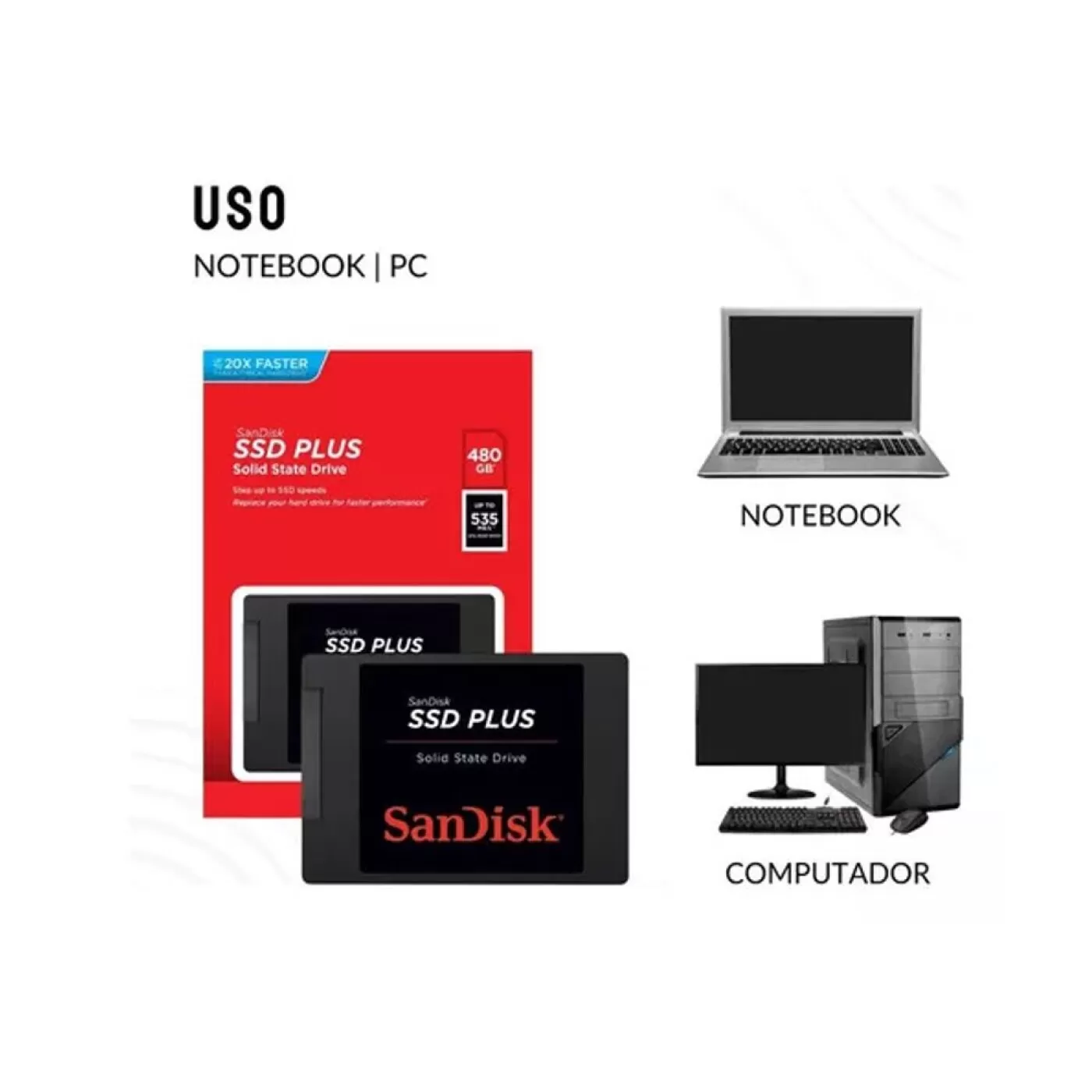 Se você procura aumentar o desempenho do seu computador, a linha SSD Plus da SanDisk é a indicada. Esta unidade de estado sólido melhora os tempos de inicialização e desligamento do sistema, também agiliza o acesso aos seus documentos digitais pessoais. Jogos?, atividades diárias de trabalho?, ou editar e reproduzir arquivos multimídia? Toda essa carga de trabalho é otimizada pelo dispositivo no seu PC, adicionado ao seu funcionamento silencioso e baixo consumo de energia.