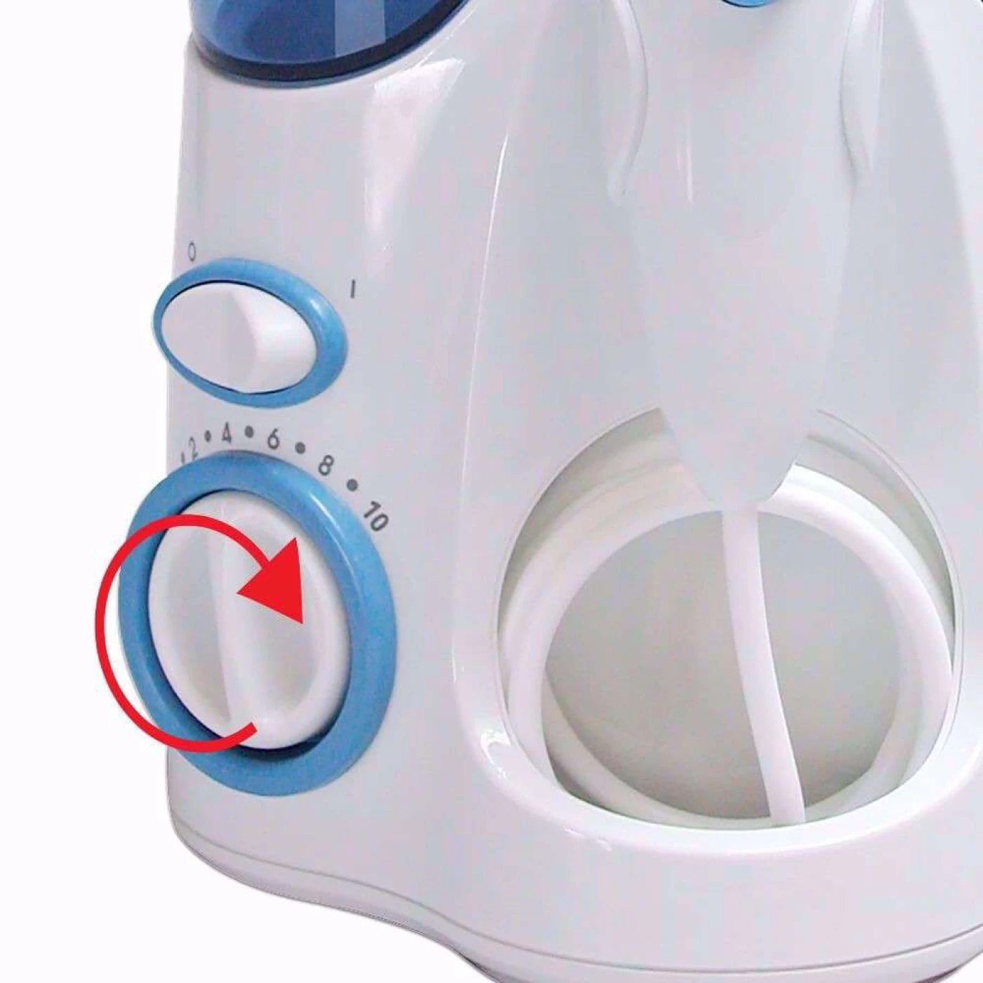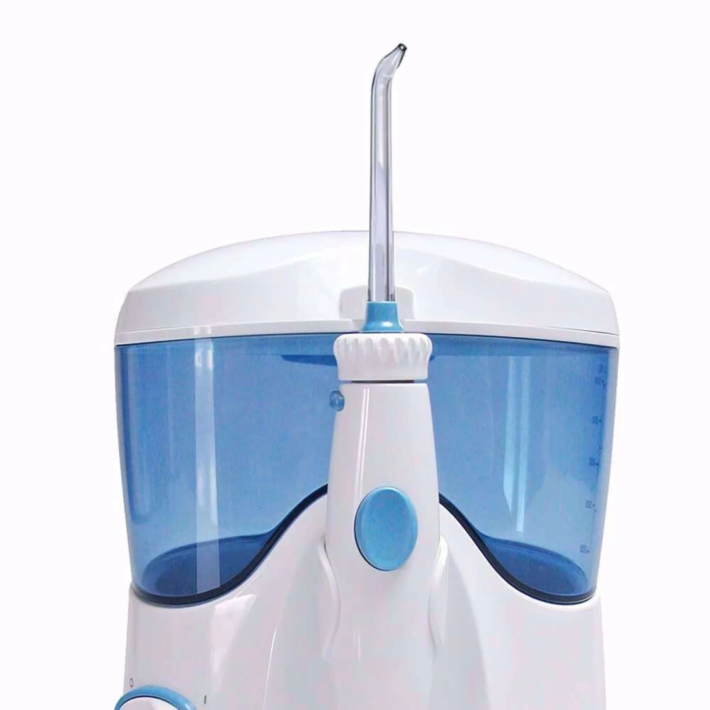 » A tampa do reservatório de água possui armazenamento coberto para a proteção dos 06 bicos que acompanham o aparelho. E o sistema de controle de pressão permite personalizar o jato de água em 10 intensidades, proporcionando eficiência e qualidade na limpeza dental e gengival.