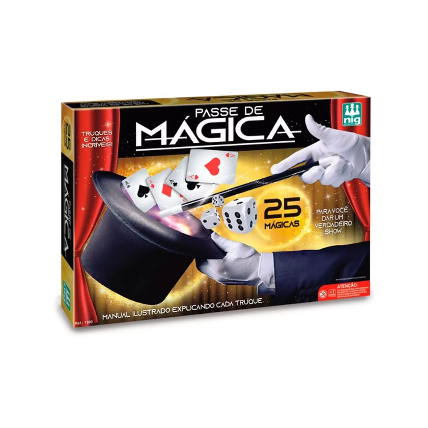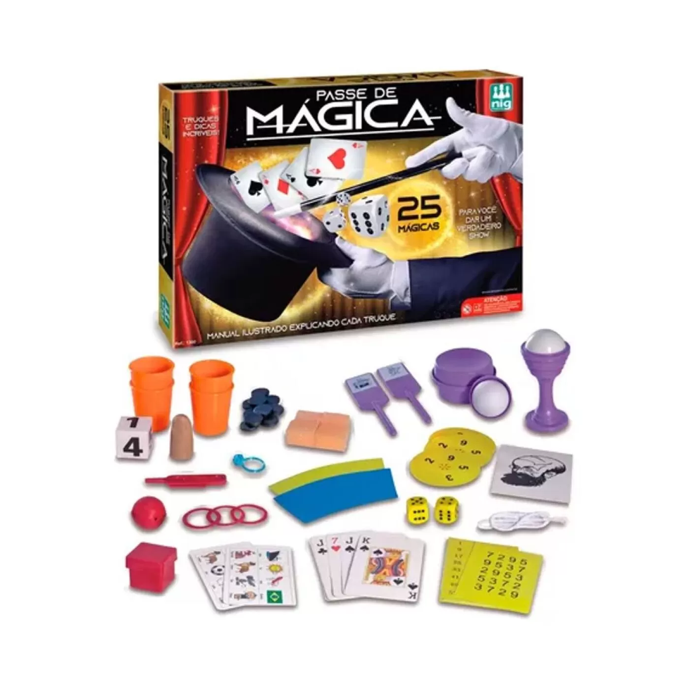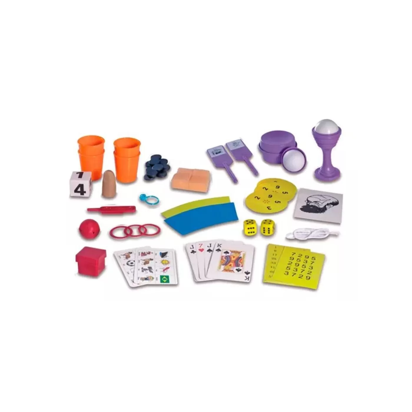 Super caixa com 25 mágicas semi-profissionais para a criança dar um verdadeiro show! Acompanha um manual desenvolvido por um mágico que descreve o passo a passo de cada número. Inclui lenço, varinha mágica, bola mágica, cartas especiais, e outros componentes divertidos.