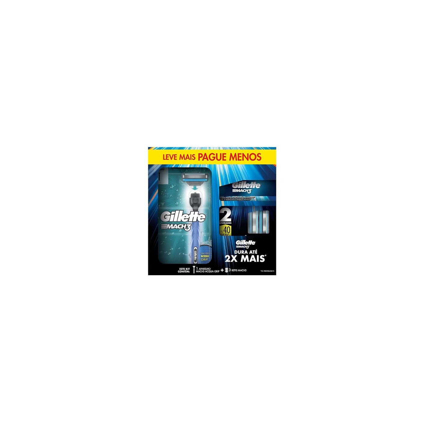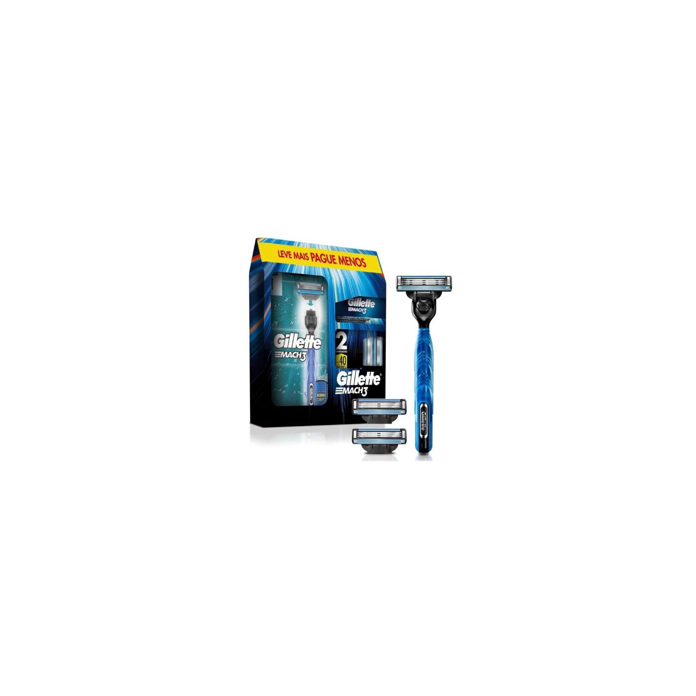 Kit de barbear completo da Gillette, incluindo 1 aparelho Mach 3 e 2 refis extras, ideal para barbear rente e confortável, com lâminas duráveis e sistema de proteção da pele. Produto original, marca reconhecida mundialmente, recomendado para todos os tipos de pele.