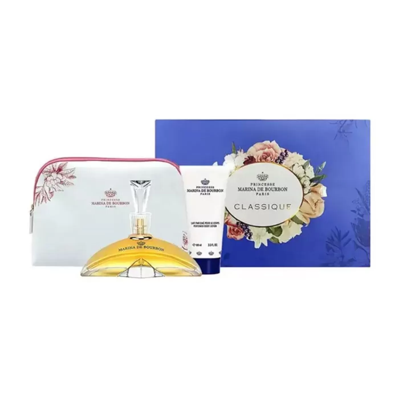 Kit de perfume e loção corporal com notas profundas e requintadas. Marina de Bourbon Classique é uma fragrância da família olfativa floral frutada para mulheres.