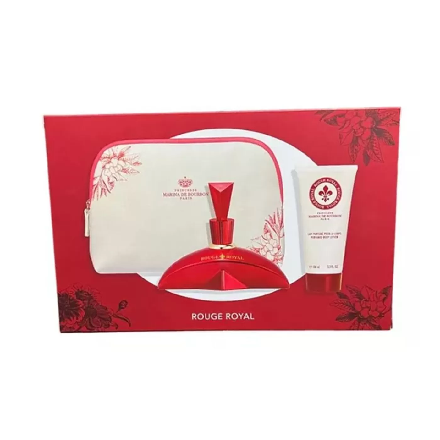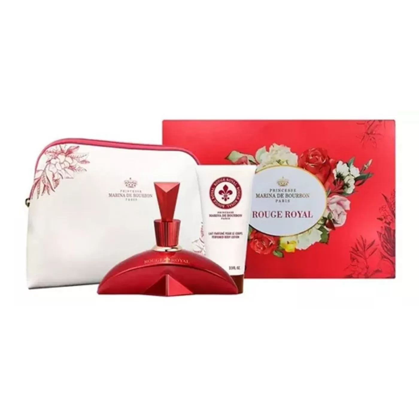 Conjunto com perfume feminino Rouge Royal floral frutal, loção corporal e nécessaire Marina de Bourbon. Apresenta fragrância quente e exótica para as mulheres sedutoras.