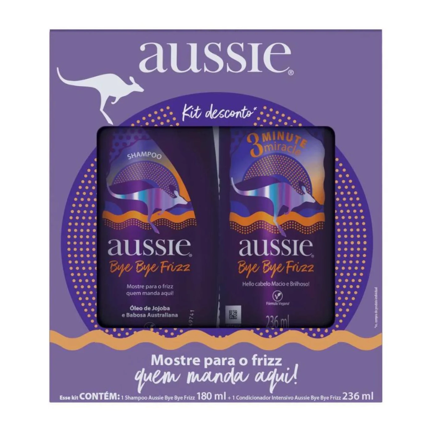 O Kit Aussie Bye Bye Frizz é ideal para quem busca cabelos mais lisos, macios e sem frizz. Composto por shampoo (180ml) e condicionador (236ml), esse conjunto promove uma limpeza eficaz enquanto nutre e controla os fios rebeldes desde a primeira lavagem. Sua fórmula contém ingredientes hidratantes e agentes suavizantes que ajudam a selar as cutículas capilares, deixando os cabelos mais alinhados e com brilho natural.