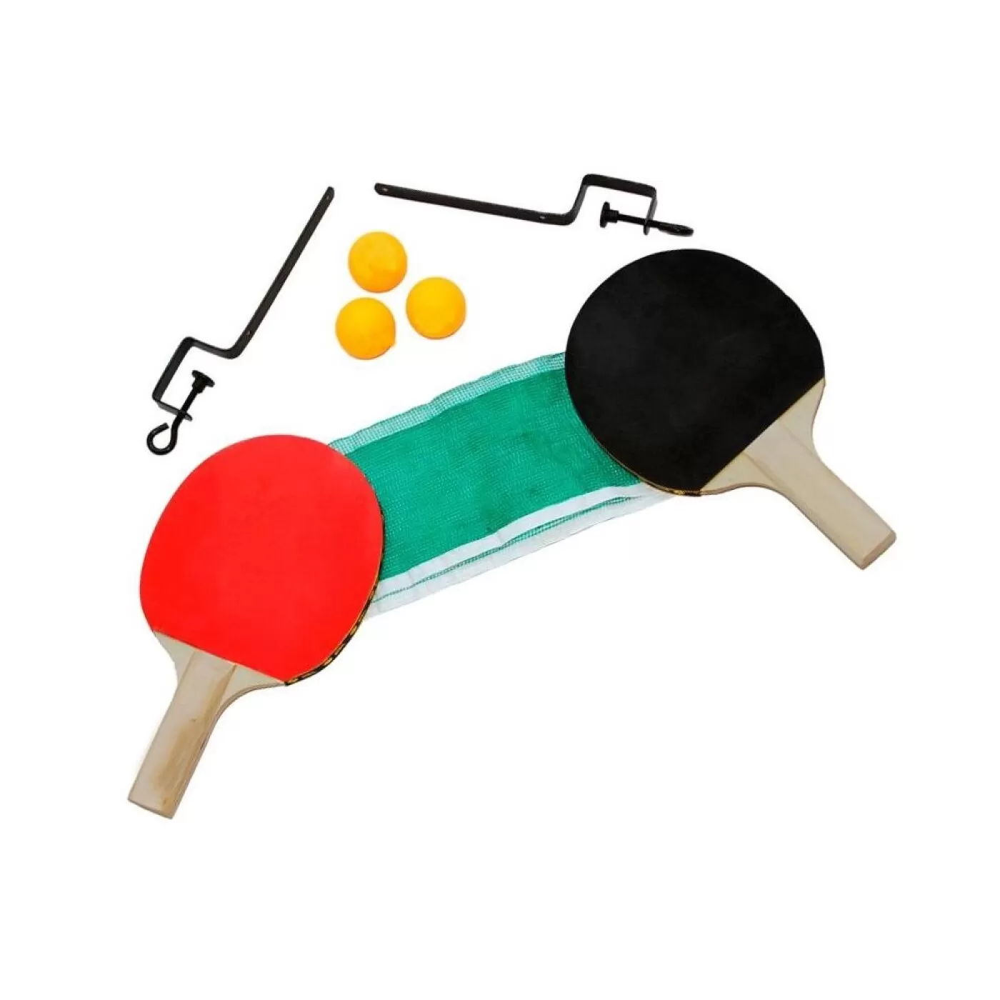 Ao comprar um conjunto de tênis de mesa, normalmente estão incluídos duas raquetes e três bolas. As raquetes possuem um design ergonômico que se adapta facilmente à mão do jogador, proporcionando conforto durante o jogo. A superfície da raquete é dividida em duas partes: a borracha e a esponja.