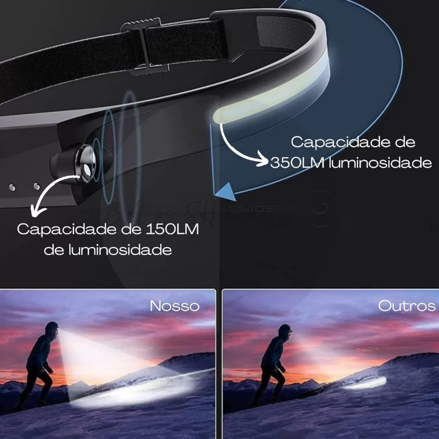Características: Modo: luz forte/ luz fraca e SOS (intermitente) Carregamento USB Bateria de lithium 1200 mAh Tempo de carregamento 2 horas Autonomia 6 horas