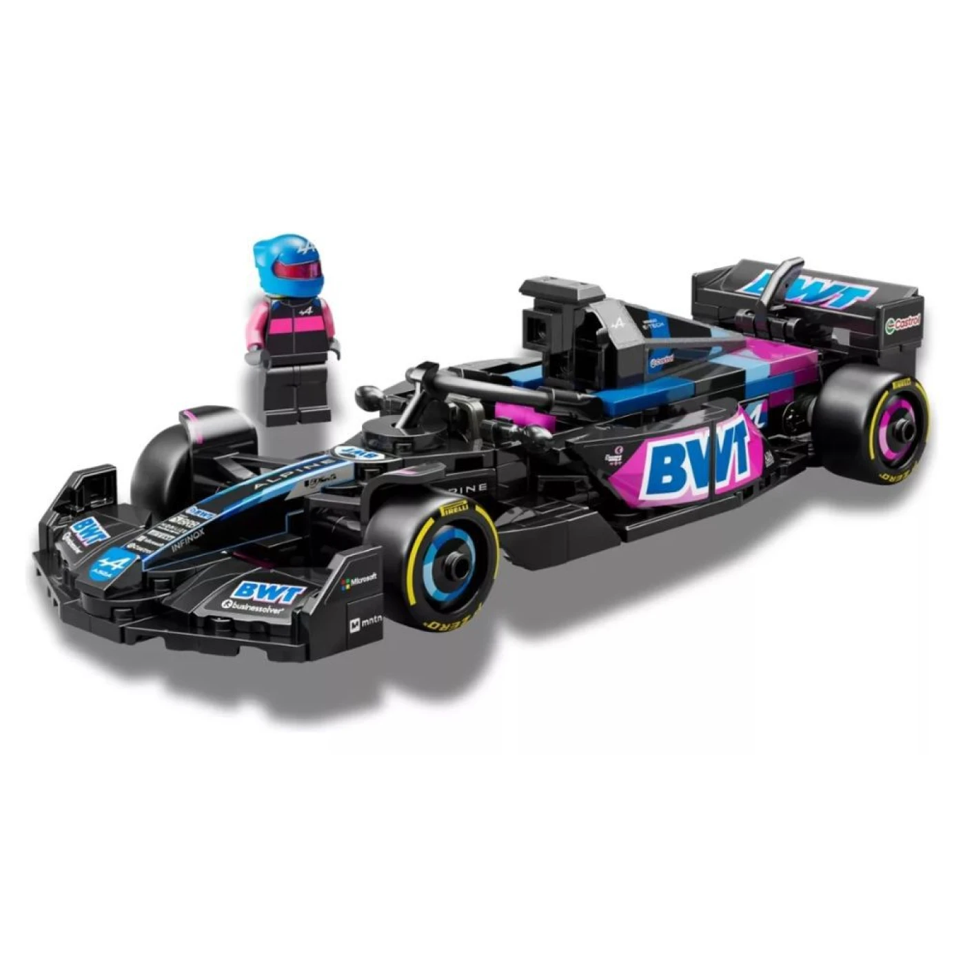 O carro inclui detalhes autênticos, como asa traseira, barra de halo, suspensão wishbone, adesivos de patrocinadores e pneus traseiros "Pirelli". Acompanham ainda uma minifigura de piloto vestindo a roupa da equipe Alpine e capacete alado para colocar dentro do cockpit.