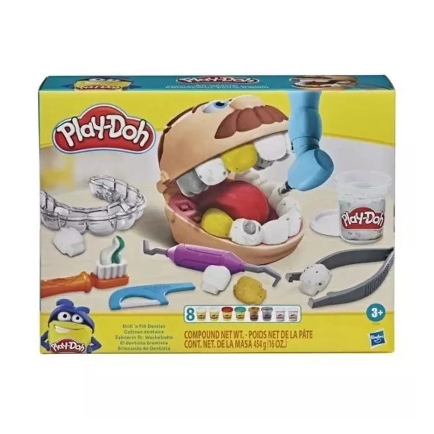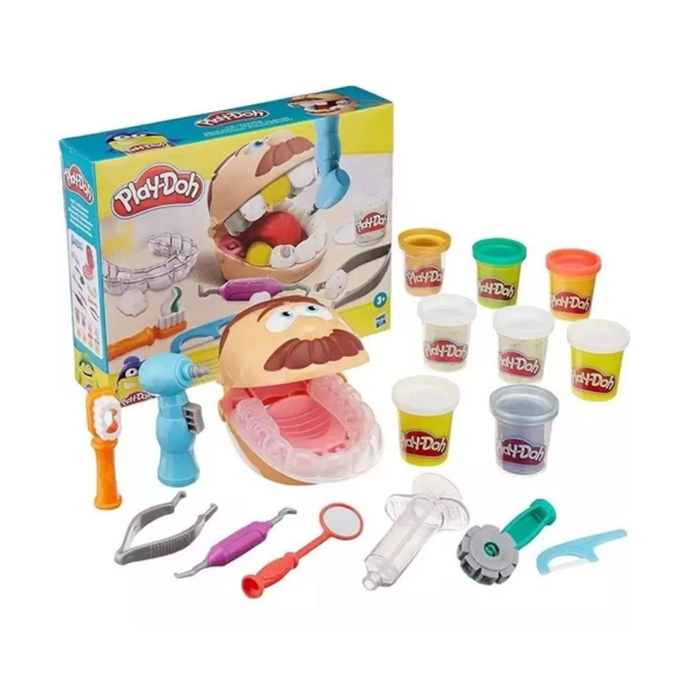 1 cabeça de dentista, 9 acessórios temáticos e 8 potes de massinha Play-Doh, entre eles 2 potes são de Burst e 2 são Metálicas.