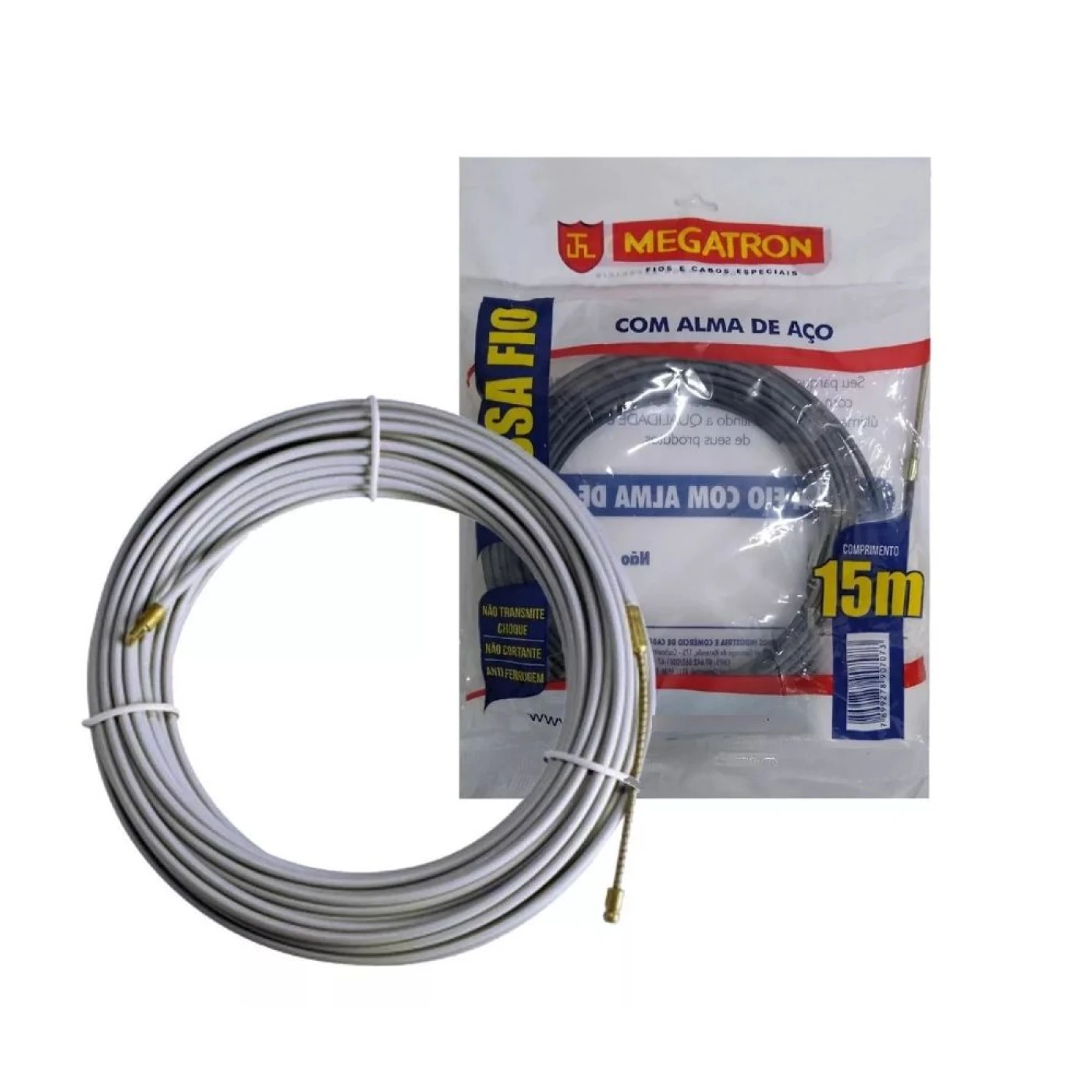 O Passa fio Megatron é durável, resistente e flexível, proporcionando facilidade nas instalações elétricas, a passa cabo não transmite choque, não é cortante e ele ainda é antiferrugem, sua alma é em aço latonado, seu corpo sextavado é de fabricado em polipropileno.