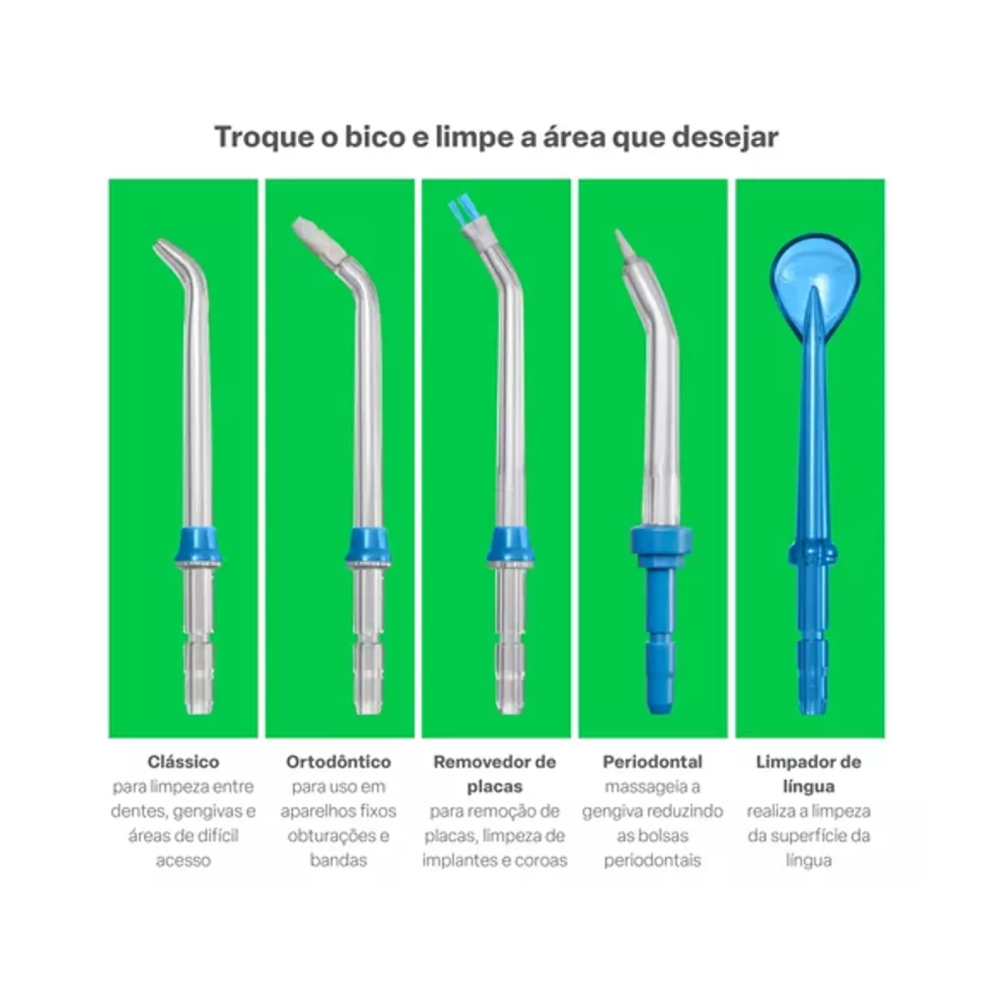 Desfrute de uma limpeza bucal completa com os bicos clássico, ortodôntico, periodontal, removedor de placas e limpador de línguas.