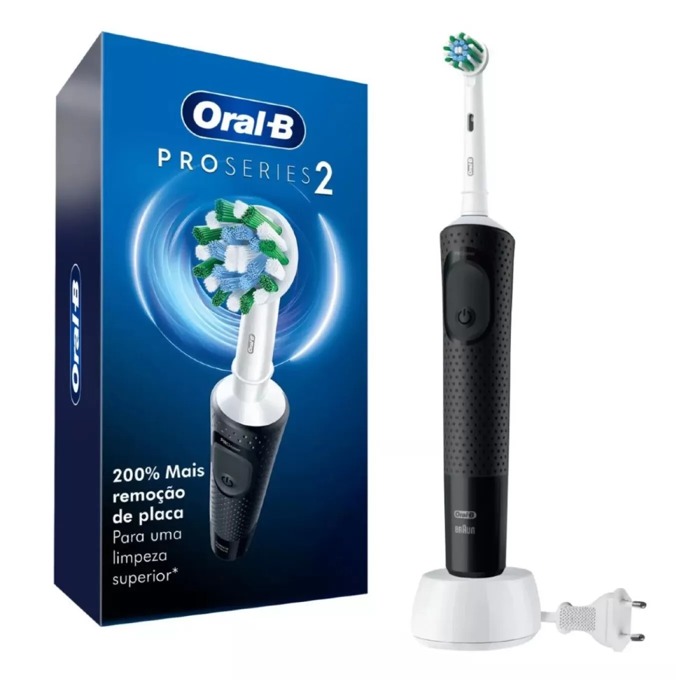 A escova de dentes elétrica recarregável com temporizador que se ajusta às suas necessidades de limpeza profunda a cada uso. A escova de dentes elétrica recarregável Oral-B Pro Series 2 oferece uma limpeza clinicamente comprovada, mais intensa do que uma escova de dentes manual normal com 2 modos de escovação: Limpeza diária e sensível, para uma experiência incrivelmente suave. Inclui um prático cronômetro na alça que ajuda a escovar os dentes pelos 2 minutos recomendados pelos dentistas.