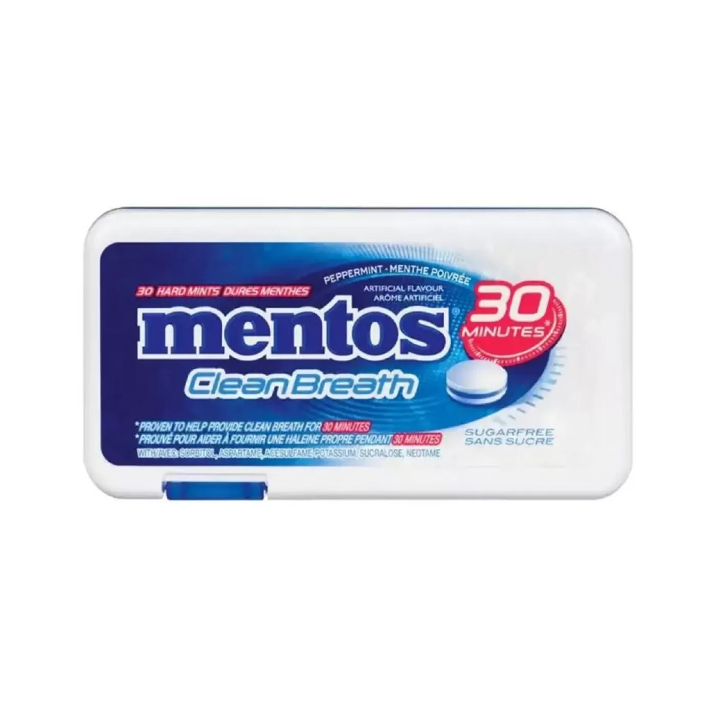 Pastilhas Mentos VITA+ ClearBreath sabor menta. Contém aromatizante sintético idêntico ao natural. Colorido artificialmente. Embalagem contém 30 unidades. Peso líquido total 21 gramas.