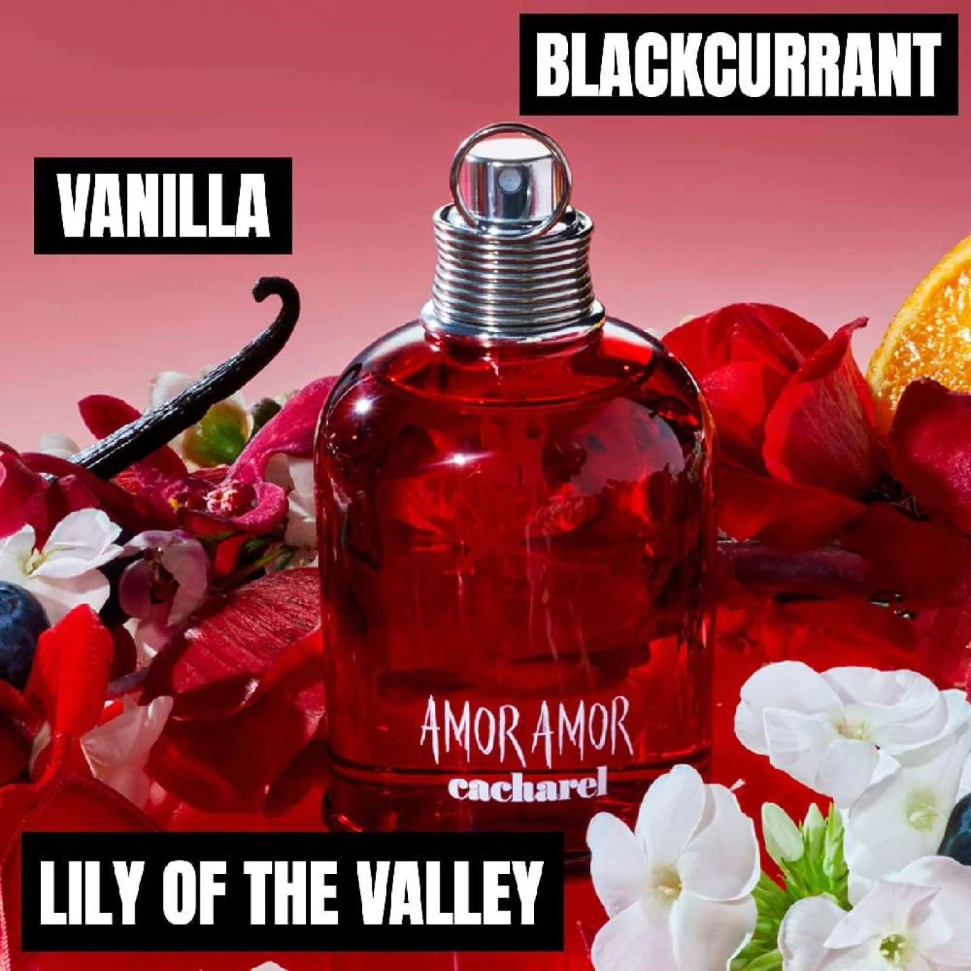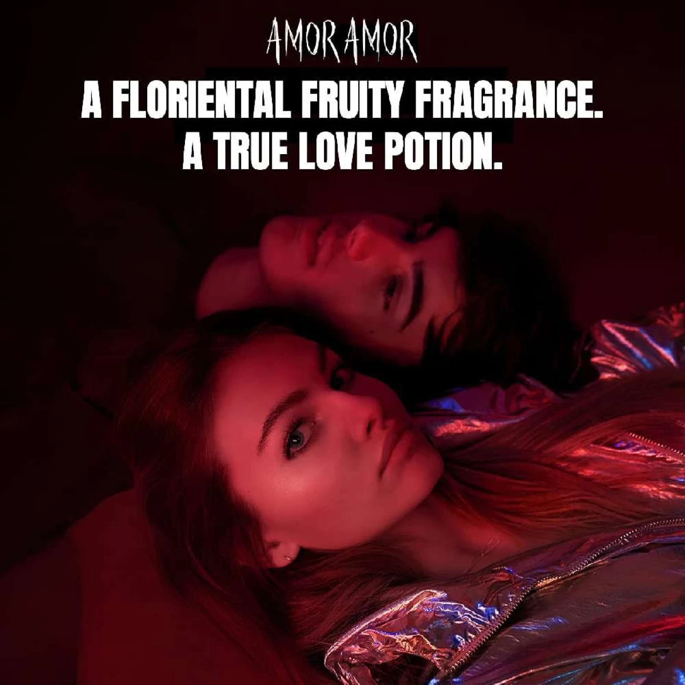 » Um grupo de amigos caminha por uma floresta. Desbravando o local, encontram uma cachoeira. Descalços, a água fresca toca seus pés. O casal se olha, suas mãos se tocam e o inesperado acontece. Impulsionados pela emoção e a adrenalina da paixão, eles correm em direção à cascata. Jovens, destemidos, encantados e com um frio incontrolável na barriga, eles se beijam sob a queda d’água. Amor Amor é o perfume da paixão e do amor à primeira vista. Intenso, imediato, vivo, eletrizante, saboroso e marcante, Amor Amor nos lembra que o olfato é o sentido mais essencial da sensualidade. O vermelho vibrante do frasco reúne notas mágicas de tangerina, cereja preta, jasmim de quatro pétalas da Indonésia, lírio-do-vale, almíscar branco e âmbar cinza.