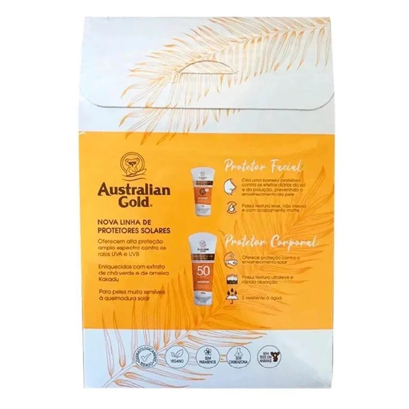O Kit Protetor Solar Australian Gold FPS50 é indicado para todos os tipos de pele. Protege contra os raios nocivos do sol, além de possuir ação antipoluição e antienvelhecimento. Os produtos contam com textura ultraleve, resistentes à água, toque seco e fácil absorção, para maior conforto e frescor durante o uso. Proteção contra raios UVB e UVA.