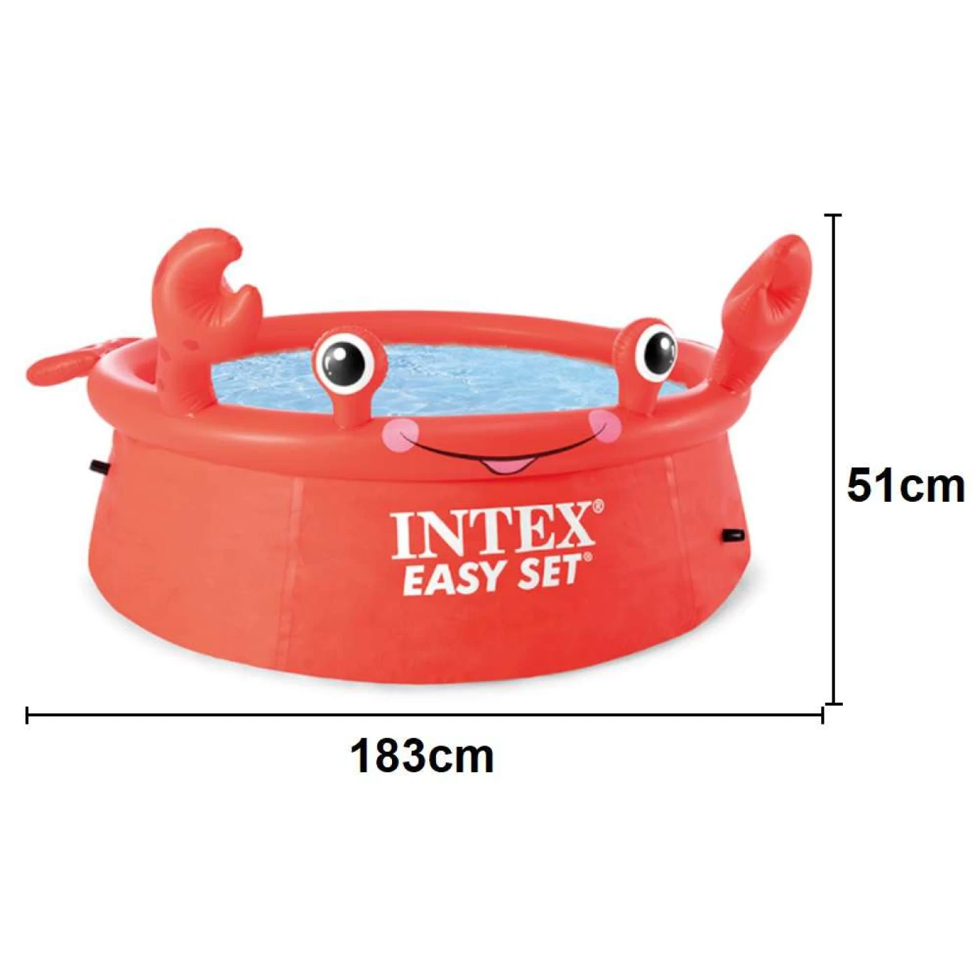 Piscina infantil INTEX com estrutura insuflável Easy Set. Divertido desenho de caranguejo, com patas, patas e olhos em relevo insuflável. Fabricado em PVC vermelho resistente. Suas medidas 183x51 cm são adequadas para 2 ou 3 crianças. Tem capacidade para 880 litros de água e instala-se em 10 minutos.