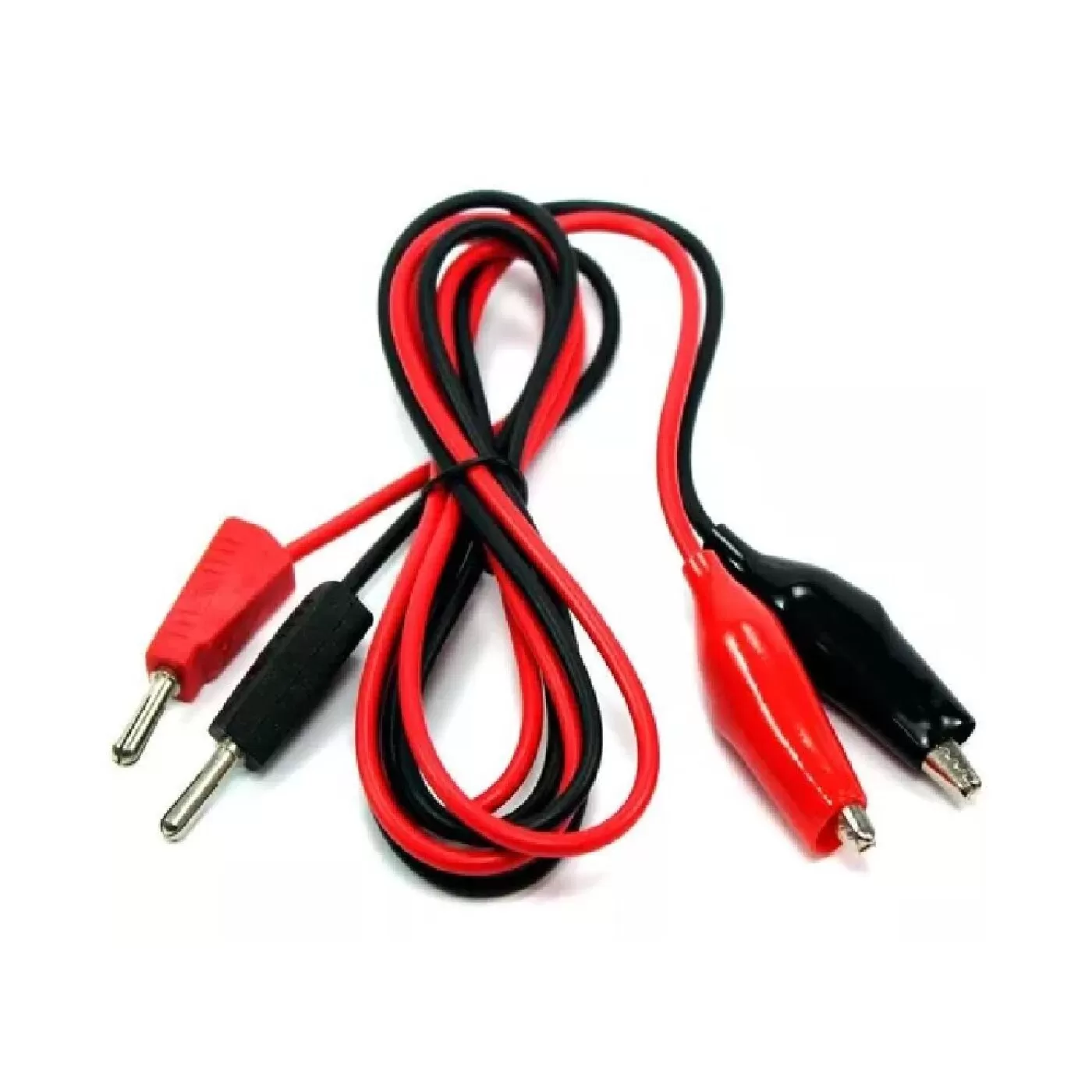 Par de cabos de conexão de aproximadamente 1m de comprimento com conector banana 4mm - macho em uma das extremidades e garra jacaré na outra.