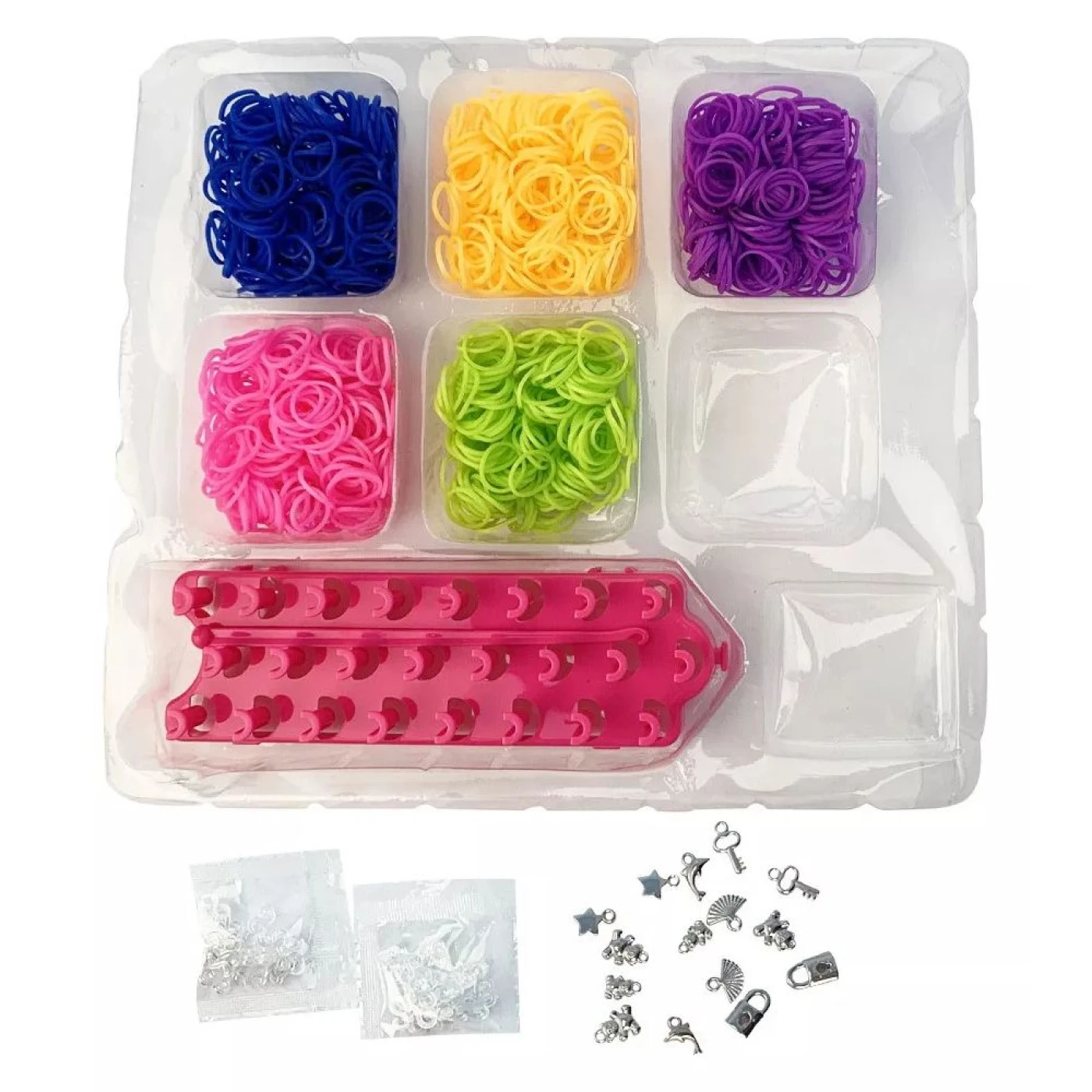 Com 42 pinos numerados no tear, você consegue criar designs personalizados e diferenciados para suas pulseiras. A fábrica vem com 1.000 elásticos em 5 cores diferentes, além de 15 pingentes superestilosos.