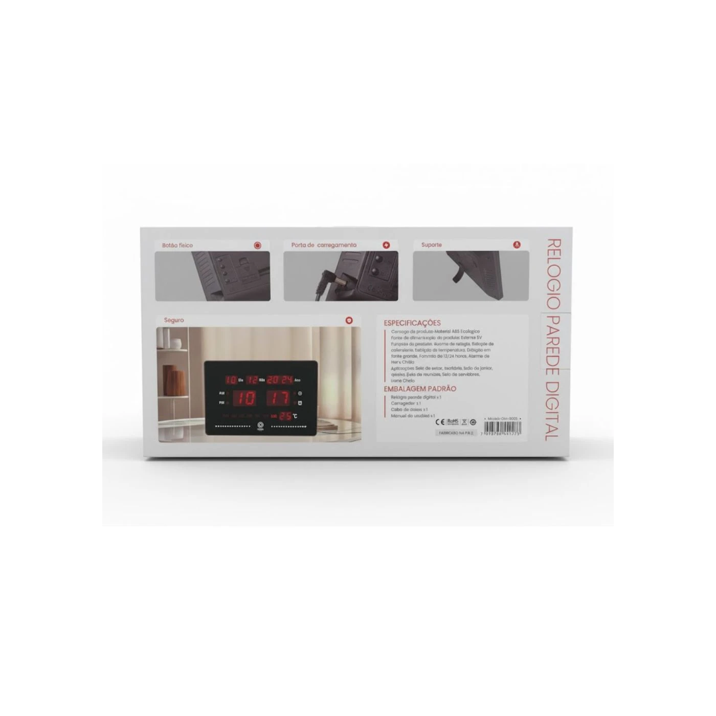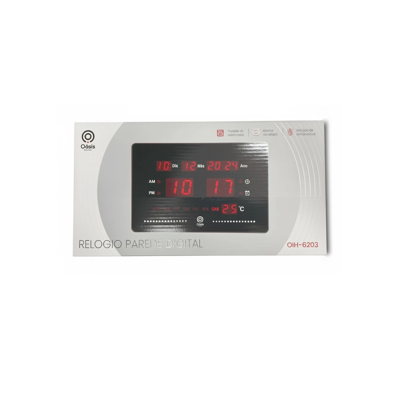 Relógio digital de parede moderno e funcional, ideal para ambientes residenciais ou comerciais. Possui design minimalista, fácil leitura e ajuste prático, oferecendo hora, data e alarme com precisão. Marca Oasis, modelo OIH-6203.