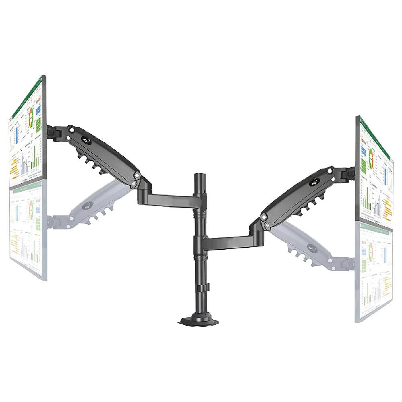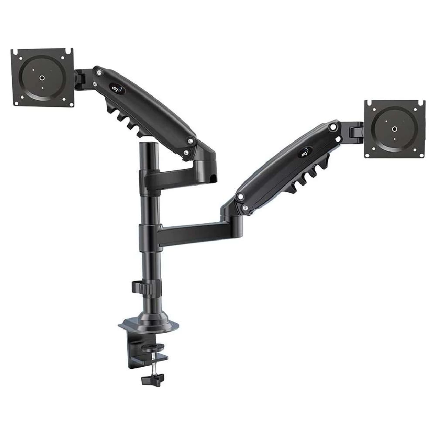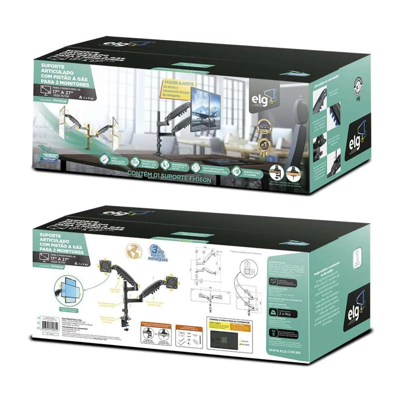 » O suporte multiarticulado de mesa ELG, para 2 monitores, modelo FH160N, possui coluna vertical rígida de 36cm, para ampliar o ajuste de altura do braço articulado com pistão a gás. Independentemente da coluna, o braço com pistão à gás possui ajuste vertical de 26cm e atinge altura máxima de até 55cm. É compatível com monitores e TVs LCD, LED de 17" a 27" que permitam fixação conforme os padrões de fixação VESA 75x75 e VESA 100x100mm, presentes na traseira das telas.