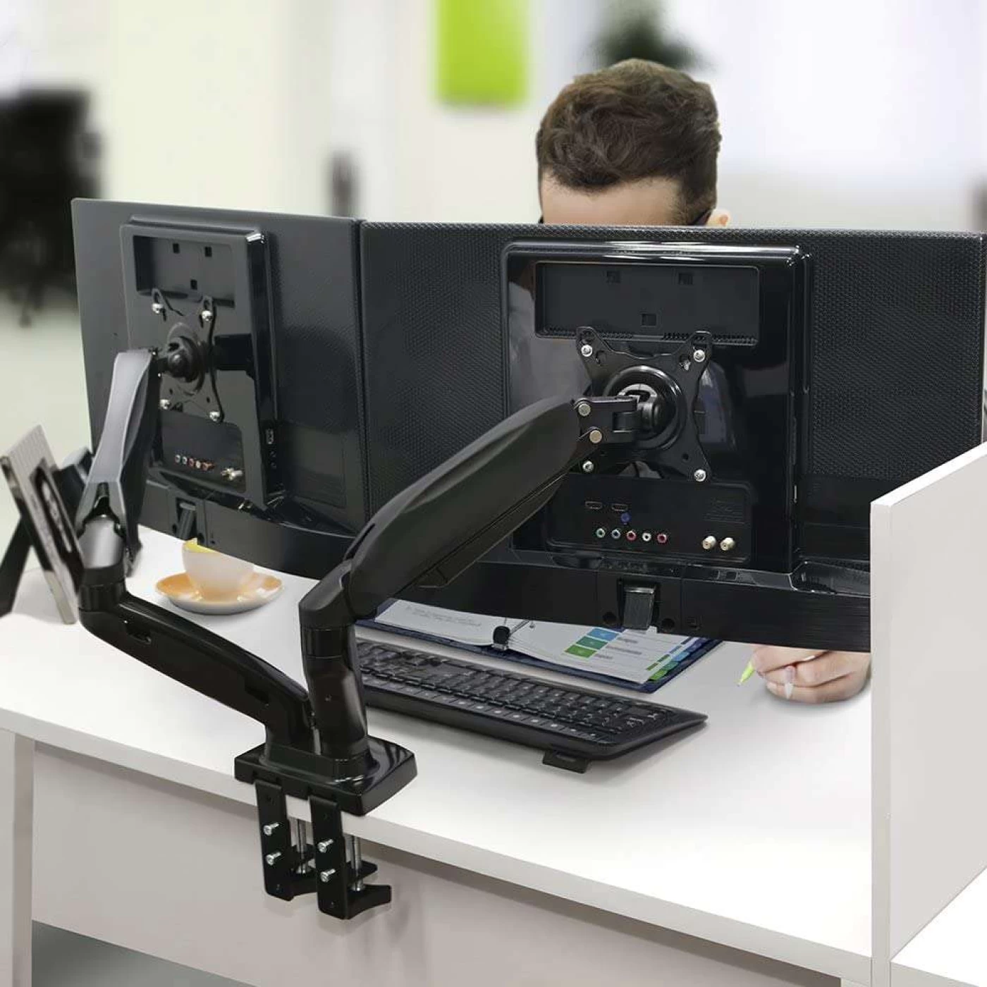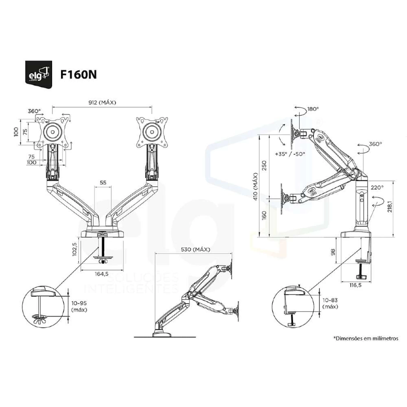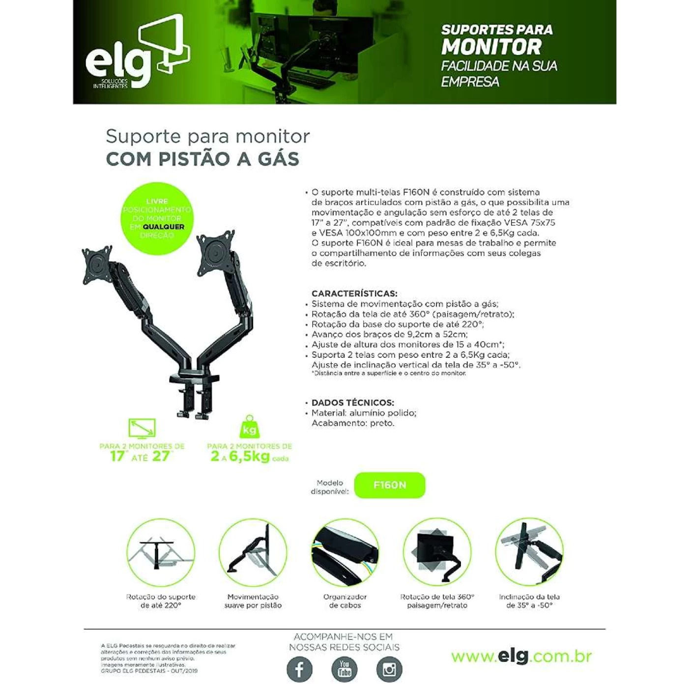 » O F160N é um suporte de mesa para 02 (dois) monitores, desenvolvido com sistema de braço articulado com amortecedor a gás (pistão), que permite movimentos suaves para um perfeito ajuste de direção e altura. Com o mínimo esforço, posicione os monitores da maneira que desejar, sem a utilização de ferramentas.