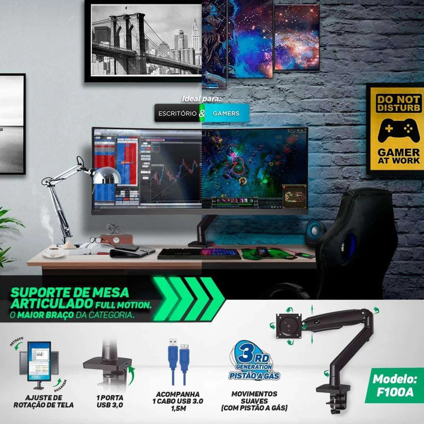 » Desenvolvido com um sistema de pistão a gás que permite perfeito ajuste de direção e altura. Com o mínimo esforço, você pode posicionar a tela da maneira que desejar. Pode ser instalado em qualquer posição da sua mesa de trabalho. É um suporte perfeito para escritórios, permitindo girar o monitor 180°+ para compartilhar informações com colegas próximos ou girar 90° para exibição de imagens. O braço é construído em material de liga de alumínio com capas de acabamentos em material polímero (plástico injetado de alta resistência). Um organizador de cabos na parte inferior do braço deixa o visual ainda mais limpo e organizado.