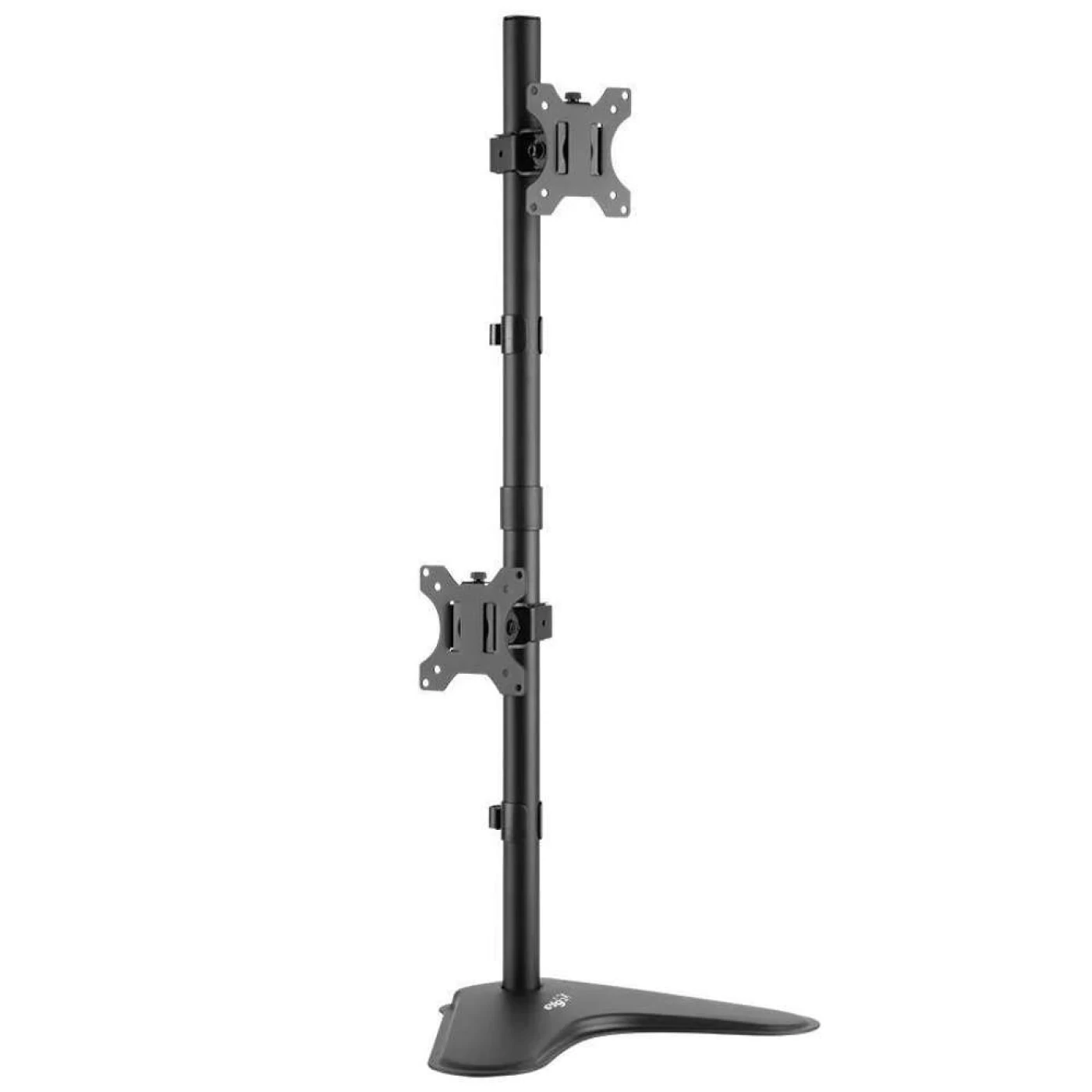 O sistema de articulação é montado no mastro do suporte e permite ajuste de altura, além de inclinação lateral, vertical e giro da tela em 360° (posição retrato/paisagem).