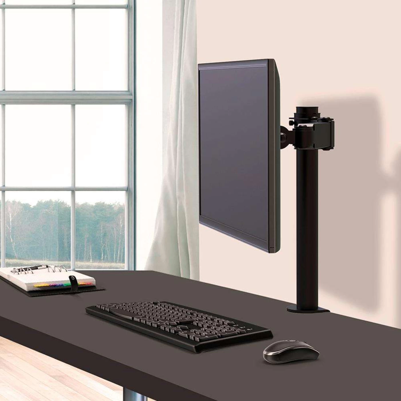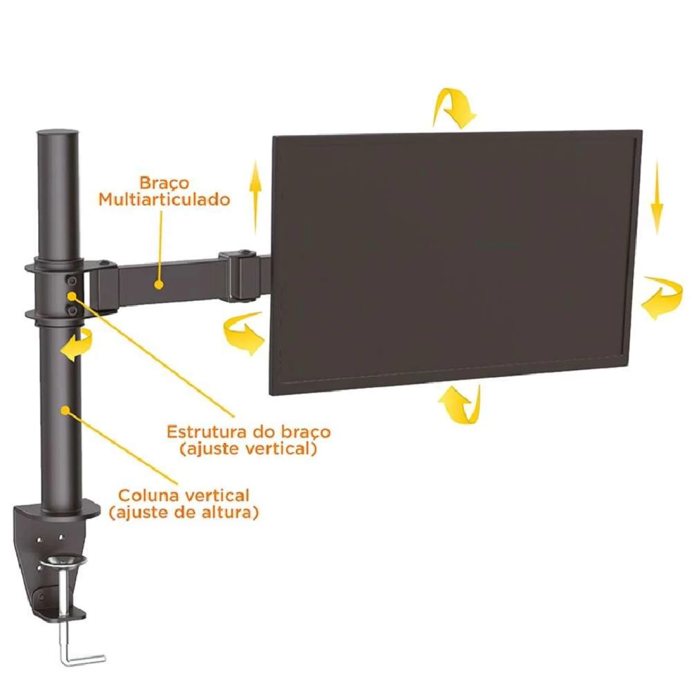 O suporte F50D possui estrutura em aço carbono reforçado, proporcionando assim, durabilidade e segurança com acabamento de alto padrão e sem cantos vivos. Versátil, acompanha ao kit do produto, estrutura para fixação do suporte em borda de mesas e para fixação do monitor.
