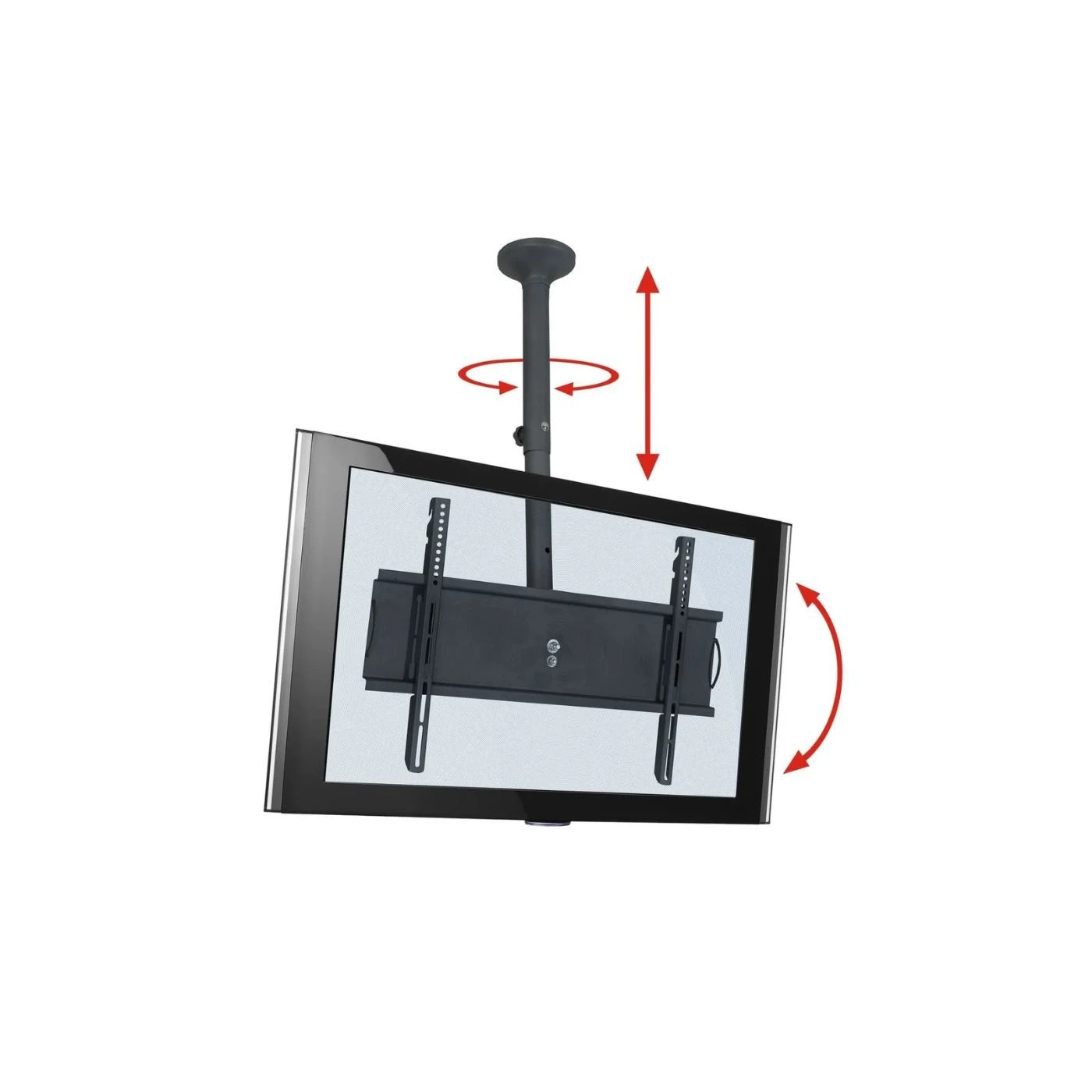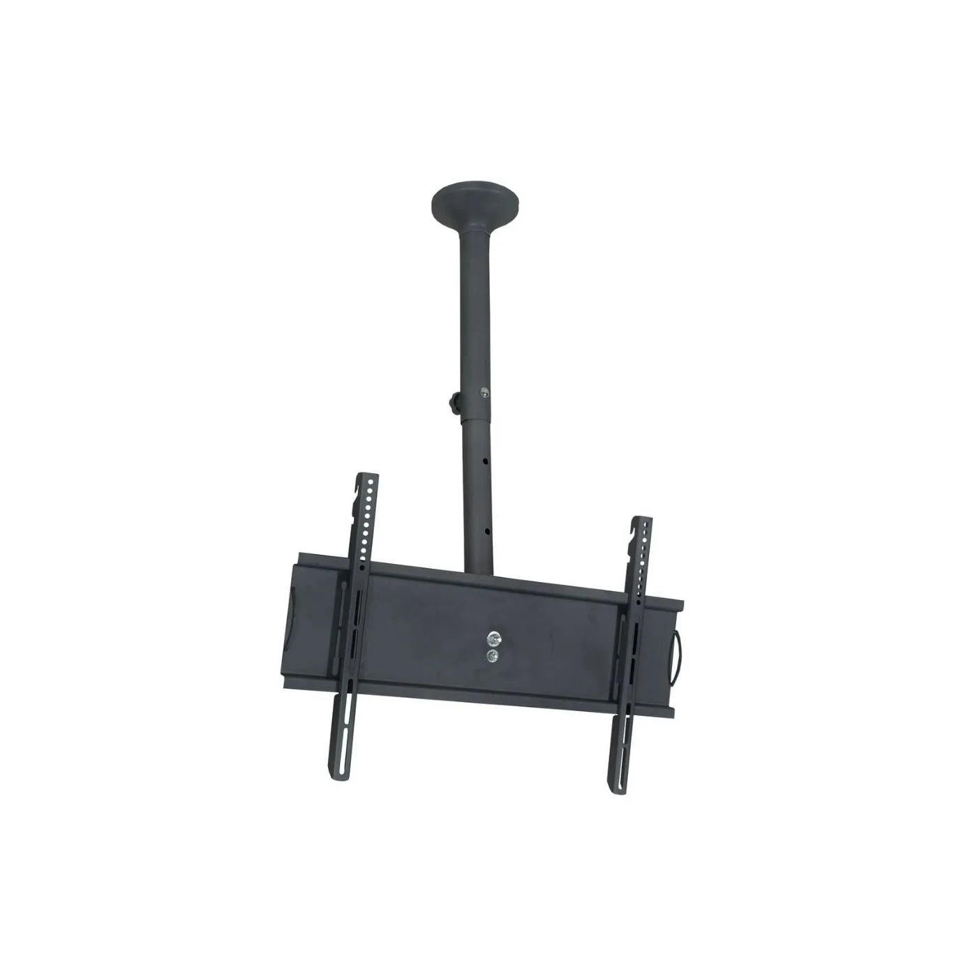 Suporte de teto Multivisão ideal para fixar até duas TVs de 32" a 65", com giro de 360° e inclinação ajustável. Estrutura em aço resistente com acabamento preto fosco, garantindo durabilidade e estabilidade. Compatível com padrões VESA, fácil instalação e segurança na fixação.