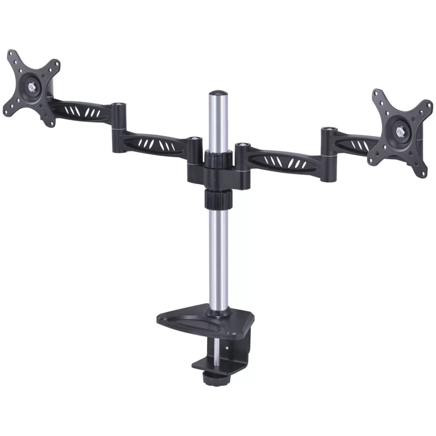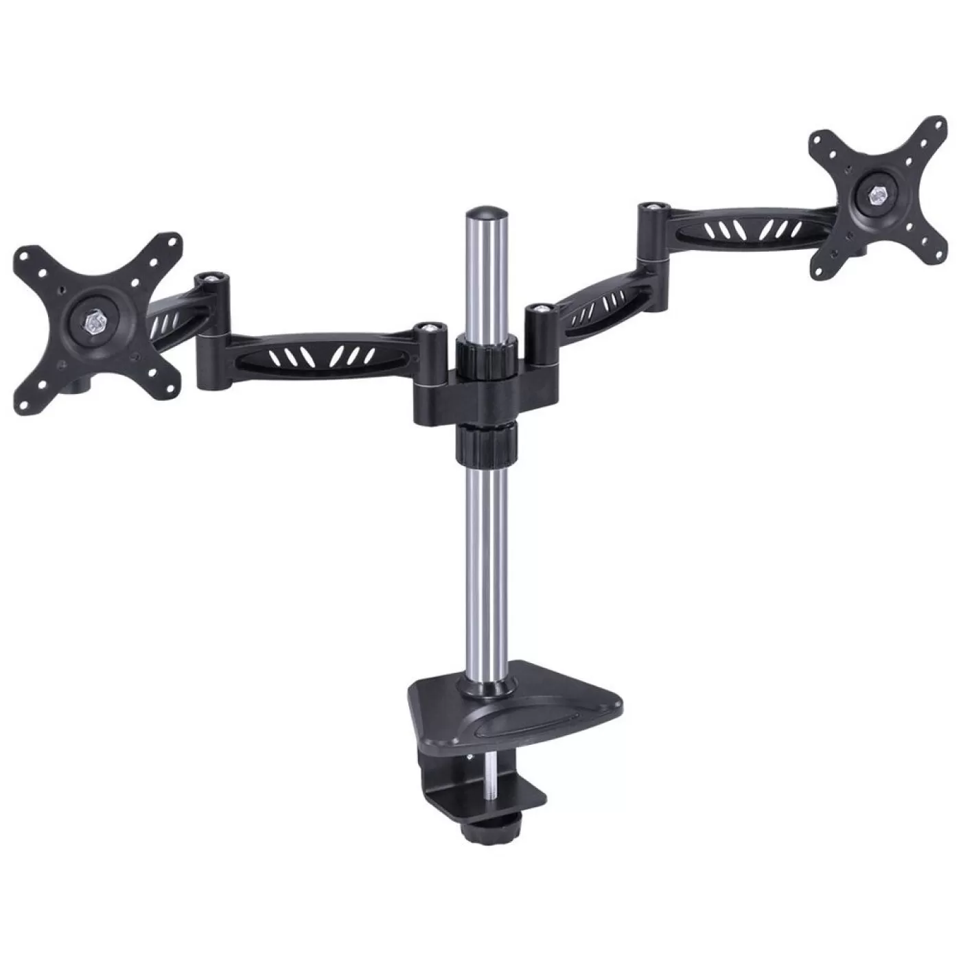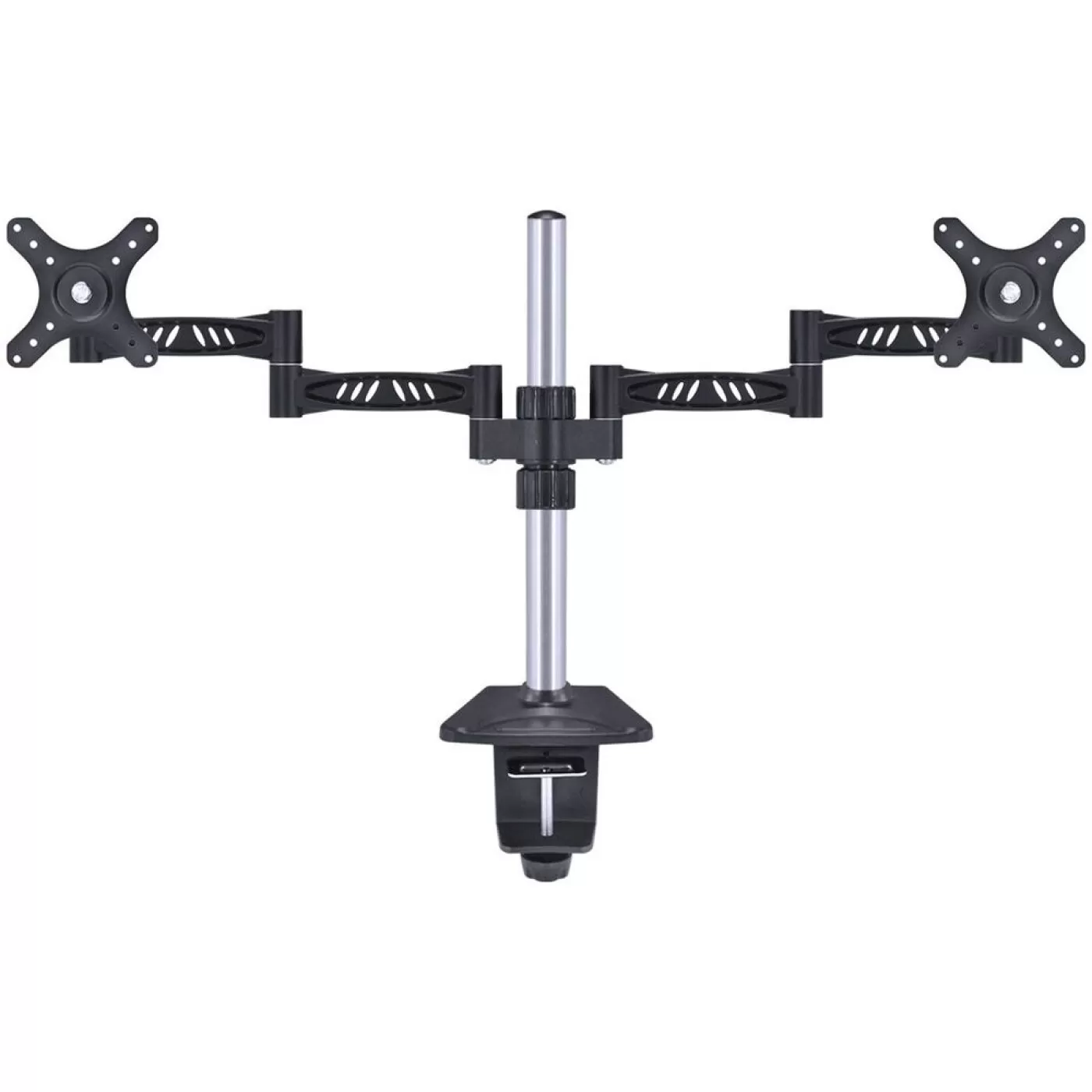 Este suporte comporta o uso de dois monitores instalados individualmente em cada braço. Os braços podem ser ajustados, possibilitando a movimentação de profundidade em dois níveis e giro horizontal. O movimento vertical é conjunto em ambos monitores.