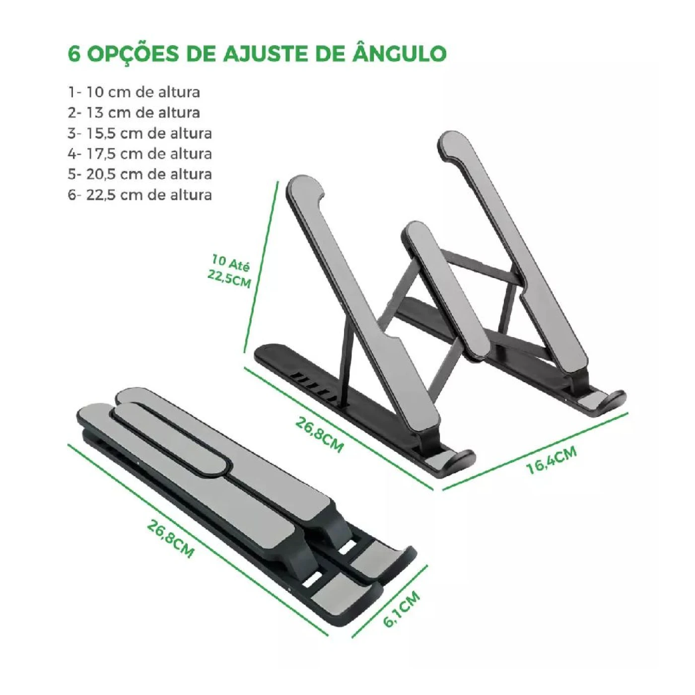 - Ajustável para diferentes alturas, permitindo que o usuário personalize a posição do notebook para sua altura e preferência.