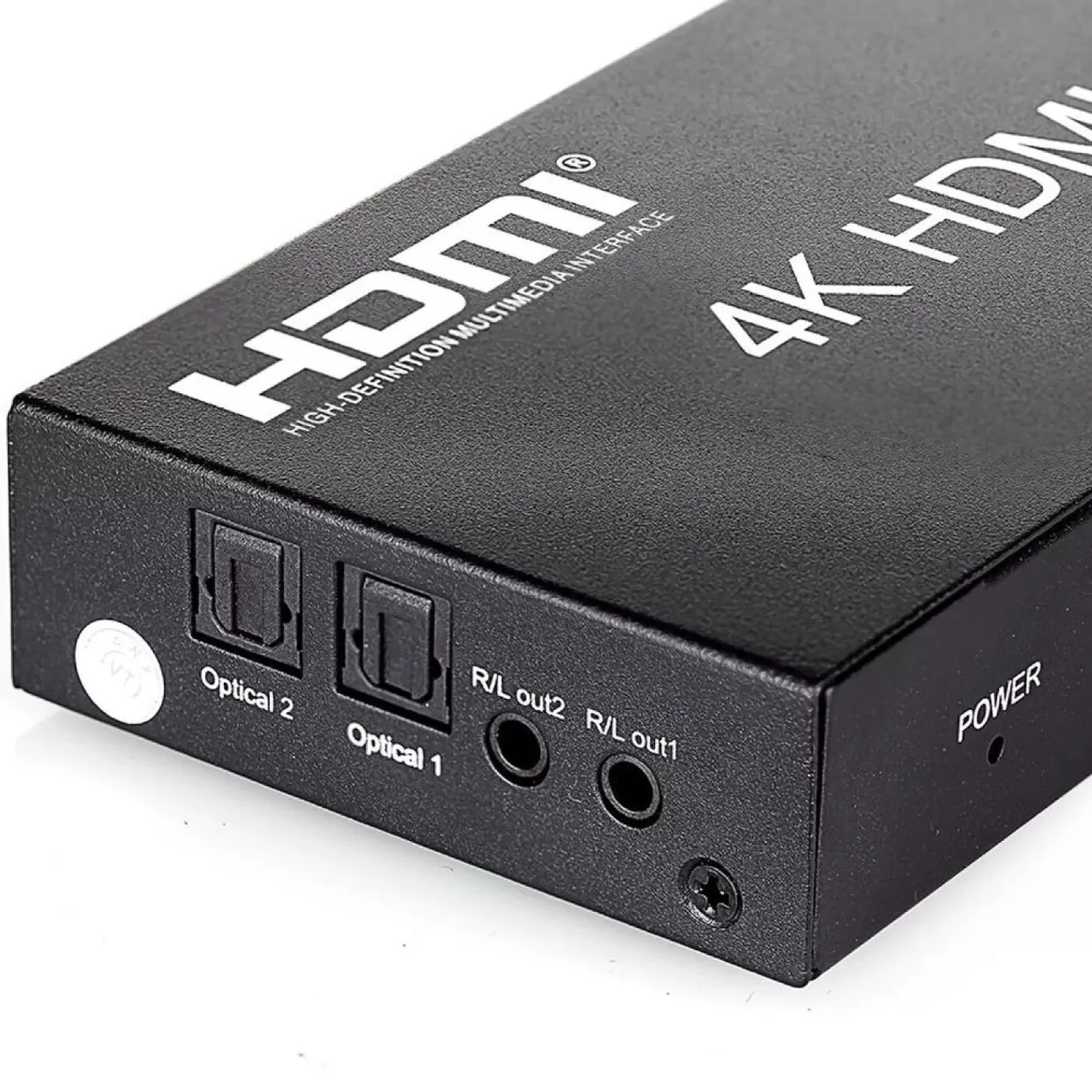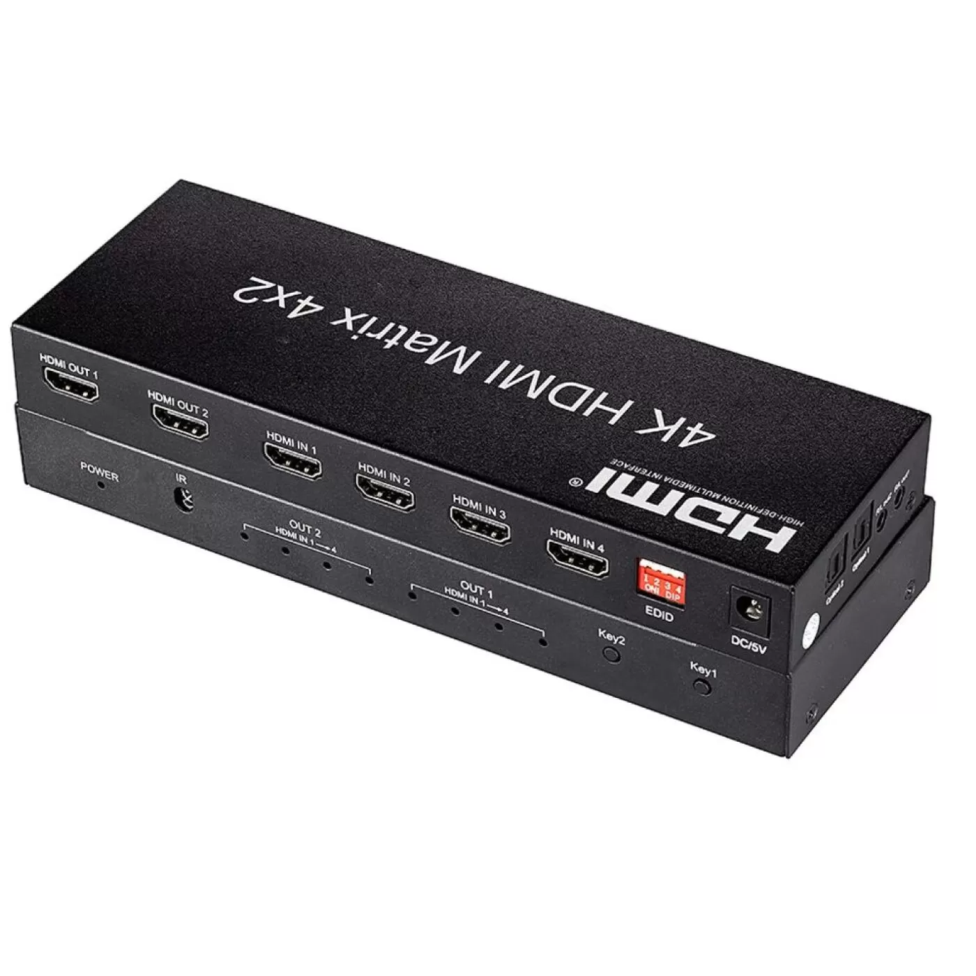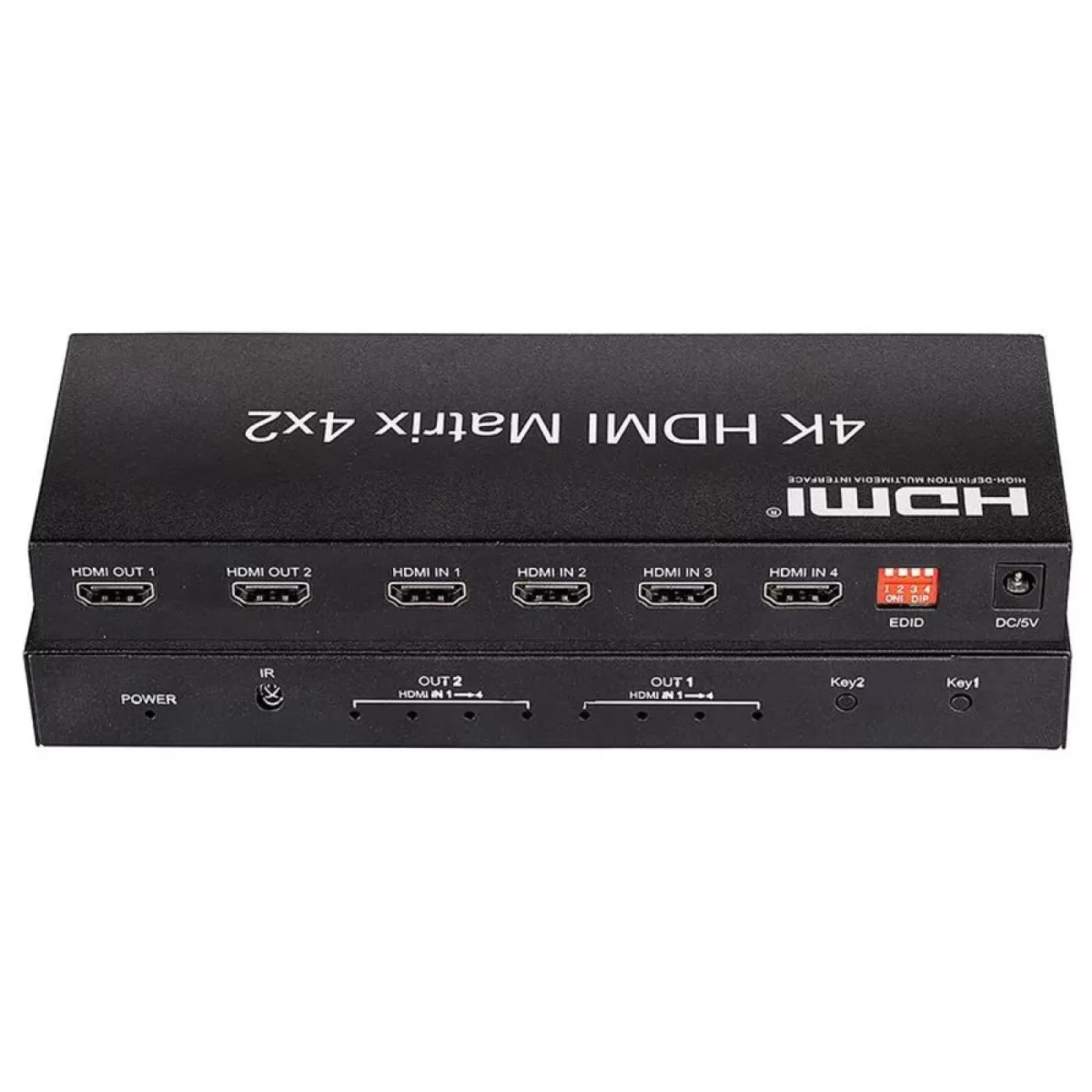 O Switch Matrix 4x2 distribui a informação de até quatro dispositivos eletrônicos compatíveis com o protocolo de transmissão HDMI em pelo menos dois terminais de exibição. Aparelho possui saída independente para cabo de fibra ótica e fone de ouvido estéreo.