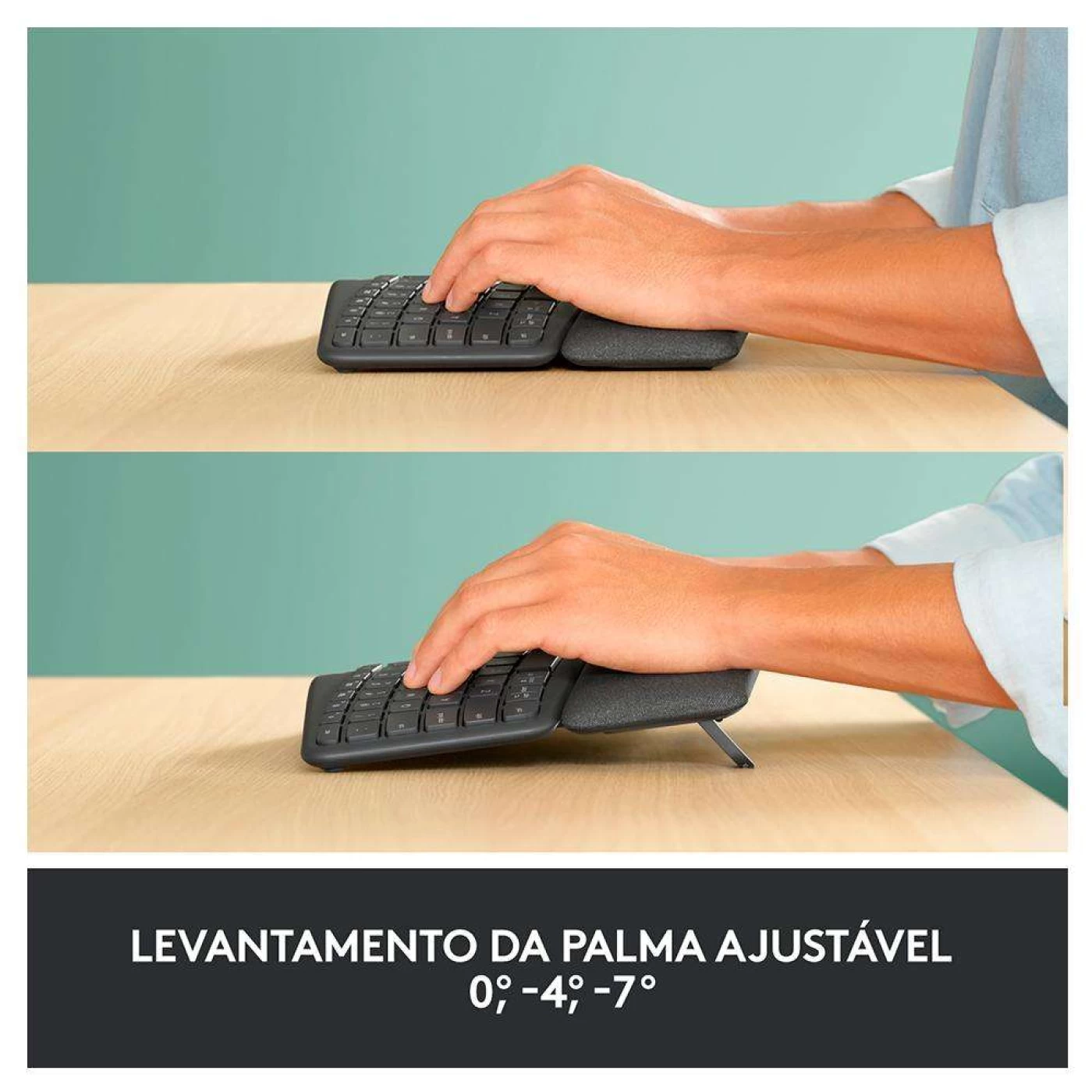 O formato curvado e dividido reduz a tensão muscular nos pulsos e antebraços. E o descanso para os pulsos almofadado oferece conforto e a posição ergonômica ideal.