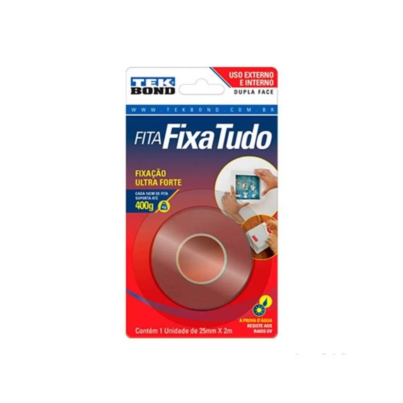 A Fita Dupla Face Fixa Tudo Externa de 25mm com 2 Metros de comprimento da Tekbond é uma fita acrílica que foi desenvolvida para promover uma fixação ultra forte de maneira fácil, rápida e segura. Com ela, é possível pendurar quadros, objetos de decoração, canaletas e uma infinidade de outras peças. Adere muito bem em madeira, parede, vidro, acrílico e metal. Cada 10cm de fita suporta até 400g.