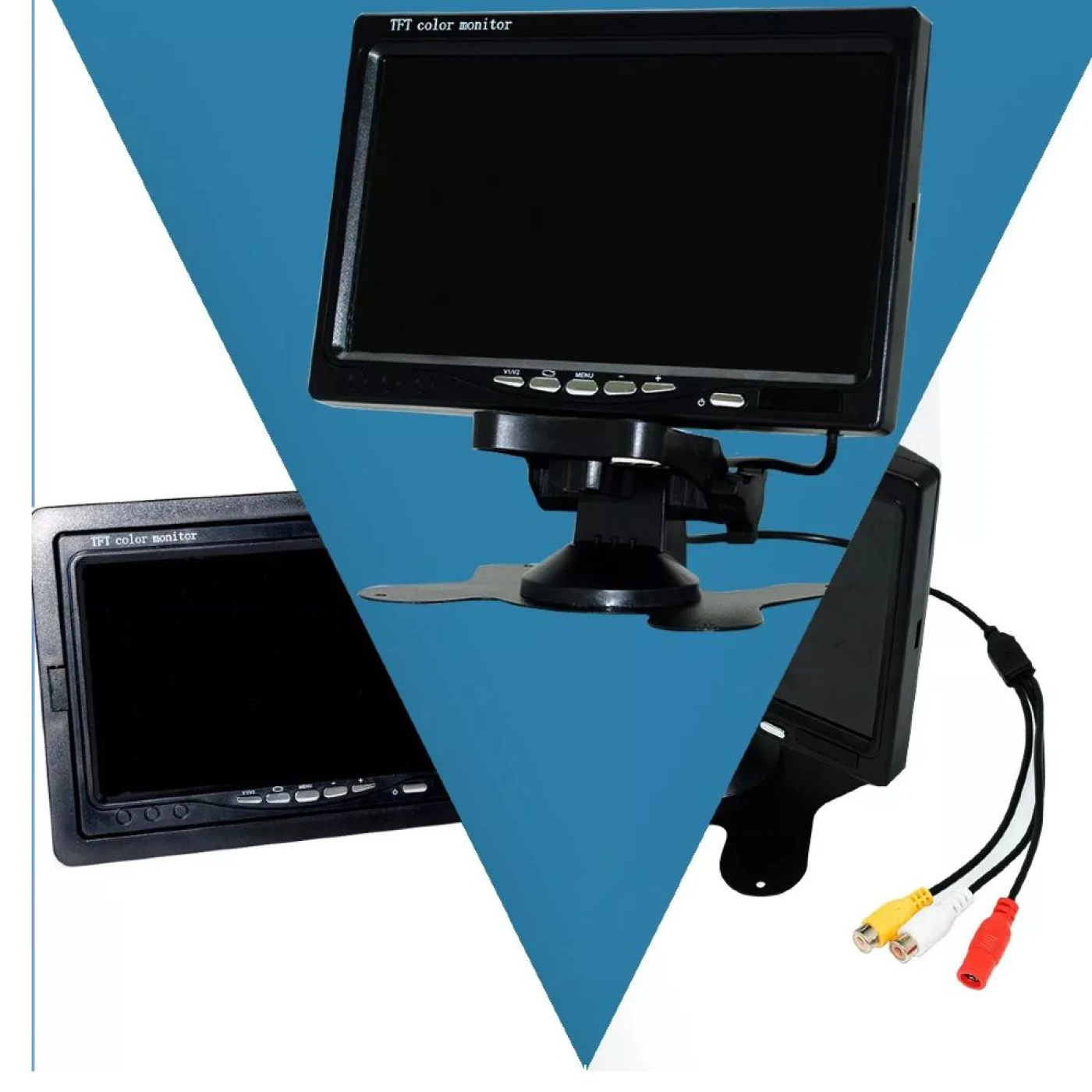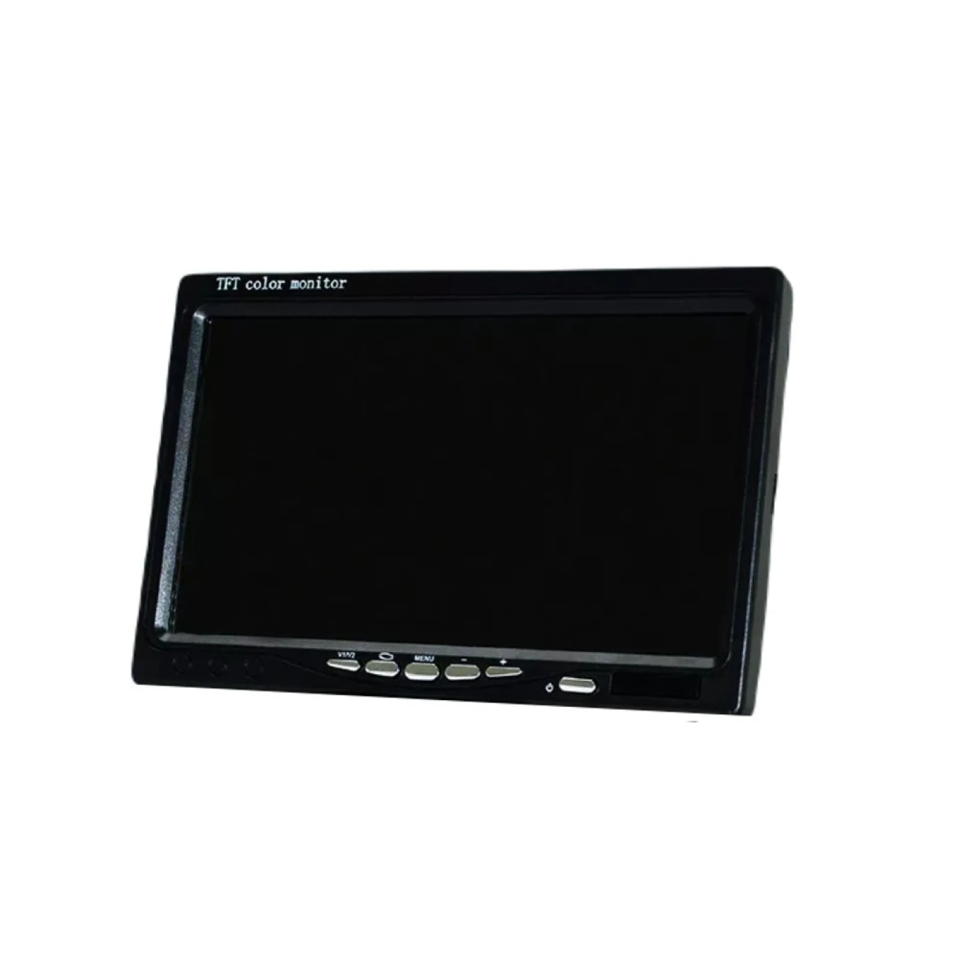 Monitor LCD de 7 polegadas colorido com alta resolução de imagem possui duas entradas AV com baixo consumo de energia.