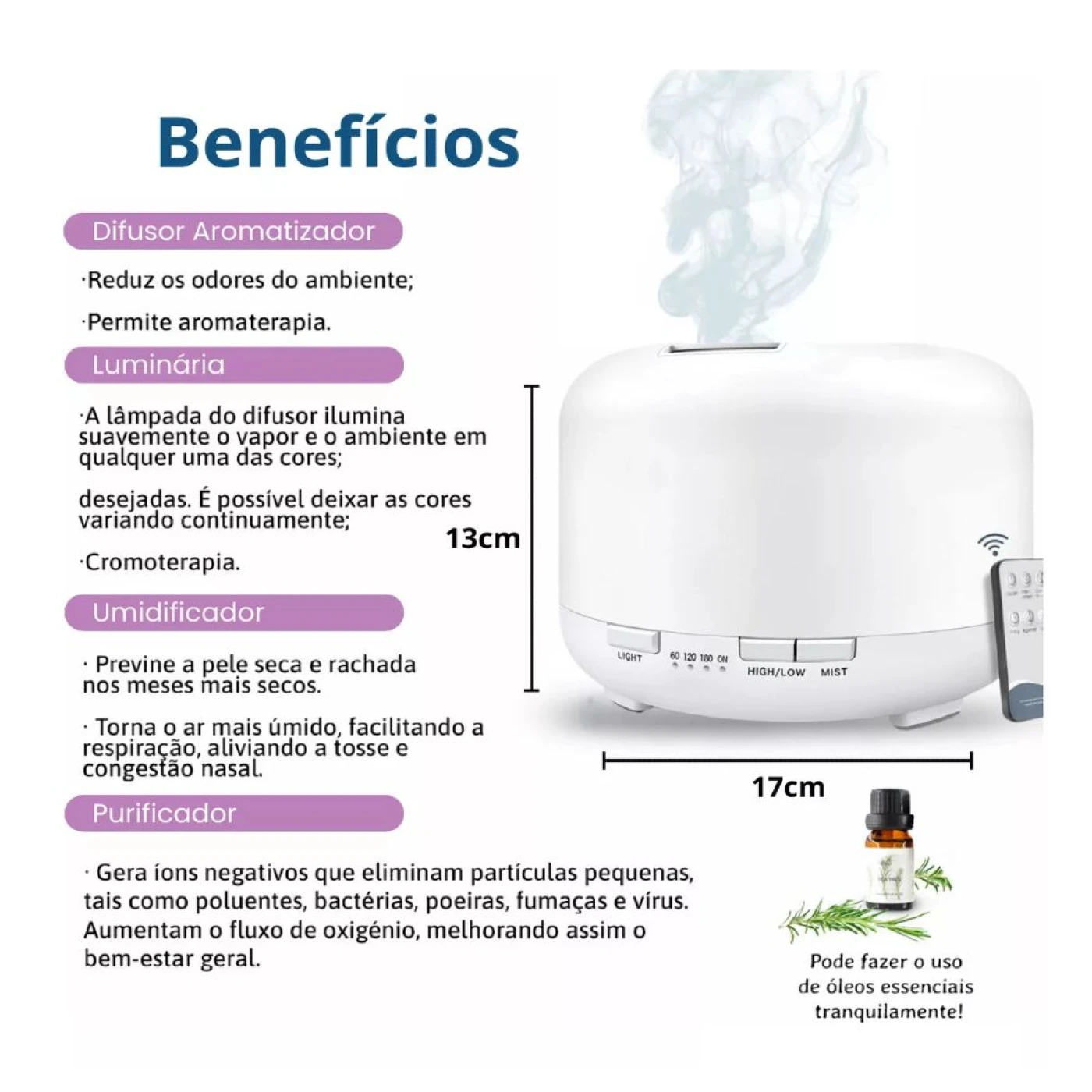 Possui uma nevoa eficiente e silenciosa, pode ser um excelente auxiliar para quem possui asma ou problemas respiratórios. O Aromatizador Difusor com luz pode ser preenchido 500ml a luz pode ser usada como abajur ou decoração de ambiente.