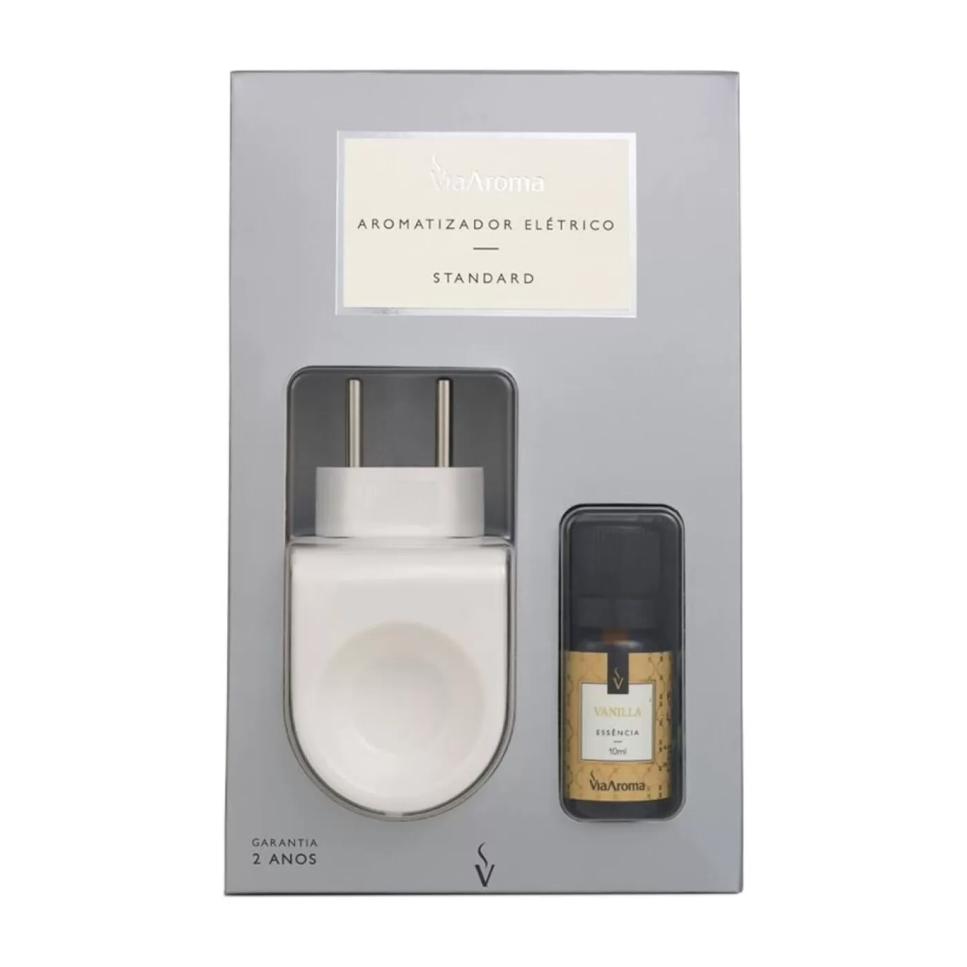 O Aromatizador Elétrico Standard é um aparelho feito de plástico desenvolvido e fabricado pela Via Aroma, que viabiliza o uso de de essências e óleos essenciais com praticidade, economia e segurança. Certificado pelo Inmetro, o aparelho é seguro e não apresenta riscos em sua permanência na tomada, seu consumo elétrico equivale a 5W/h (20 vezes menos que uma lâmpada convencional), além de possuir sistema que mantém a temperatura constante. É bivolt e o plug se adapta a orientação da tomada. Possui garantia de dois anos.