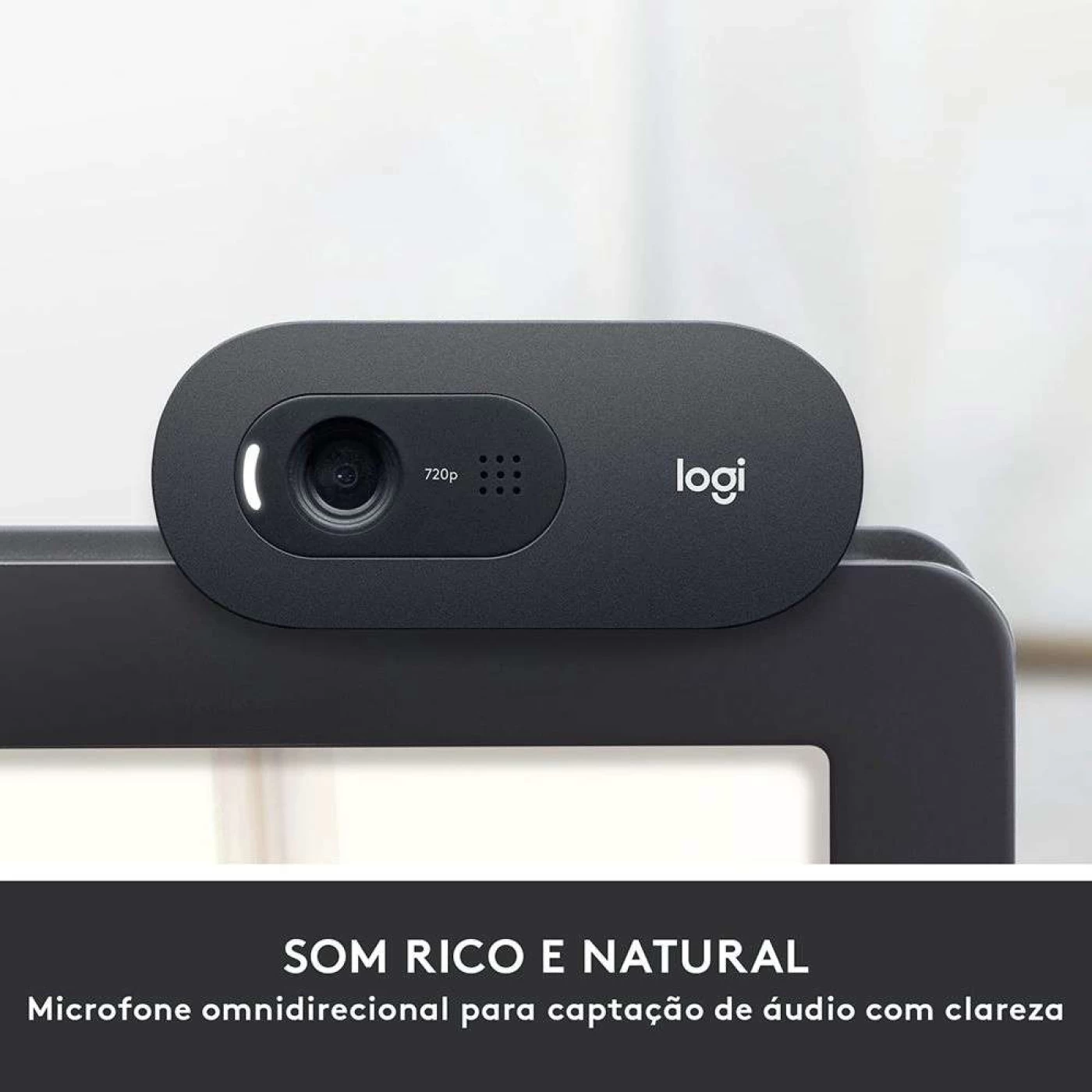 Webcam com vídeo HD 720p e microfone de longo alcance.